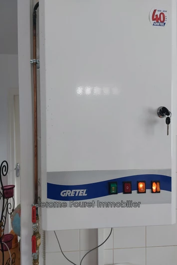 Appartement au 1er étage d'un immeuble, comprenant, hall d'entrée, espace de vie, 2 chambres, salle d'eau, wc. Chauffage : chaudière électrique.