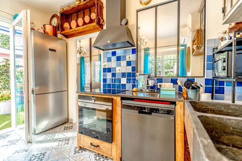 Vente villa Sainte-Maxime. A seulement 300 mètres du centre-ville et de la plage, édifiée sur un terrain plat piscinable de 768m² exposé plein sud, superbe maison de plain-pied. Elle se compose : Hall d'entrée, wc invités, séjour avec cheminée, cuisine indépendante équipée, 2 chambres, 2 salles de bains avec douche...