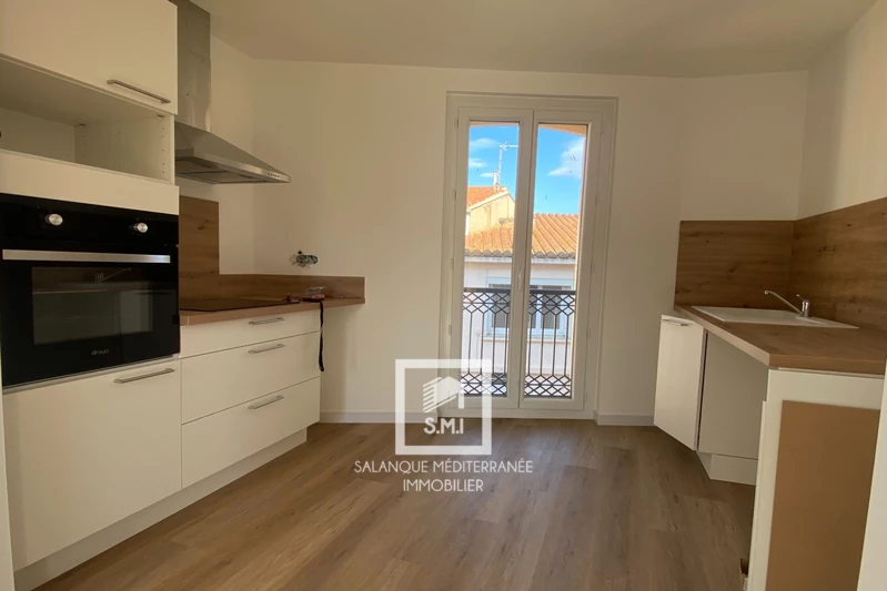 For rent - Renovated 3-room apartment - Salses-le-château This fully renovated 3-room apartment, on the first floor of a small building, is located in the town centre of Salses-le-Château. It consists of two bedrooms, a living room, a fitted kitchen and a shower room with WC. It also has a terrace. The apartment is...