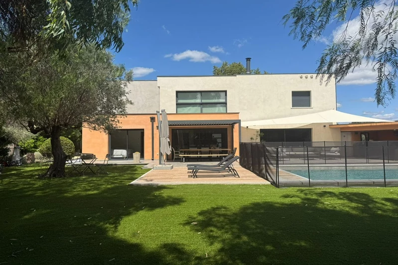 Beautiful family villa of approximately 165 m², almost entirely on one level, featuring 5 bedrooms, a pool, and a double garage, set on a landscaped 1,000 m² plot, renovated by an architect in 2021. Spacious rooms and high-end features typical of a contemporary home (ducted...