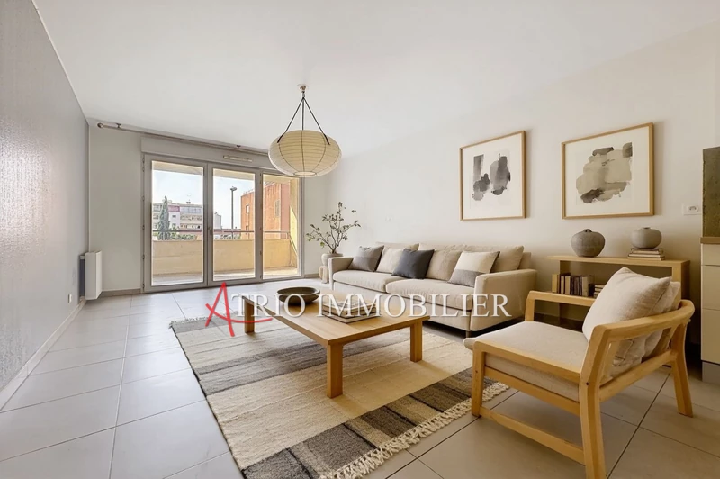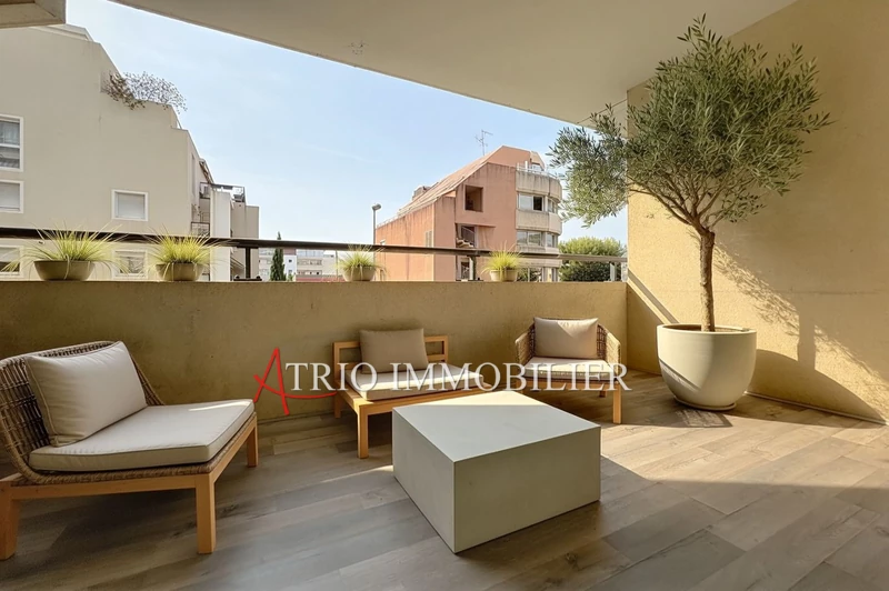 St Laurent du Var - Vespins A stone's throw from the seaside and the St Laurent port, superb 3-room corner apartment of 65 m² with 60 m² of exterior space! In a luxury residence, it is composed of a very large living room with equipped American kitchen, two large bedrooms, a tiled bathroom and a separate toilet. In...