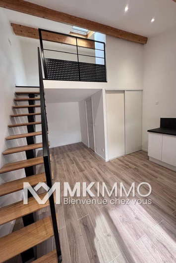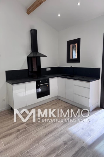 It features a living room with a semi-equipped open kitchen opening onto a...