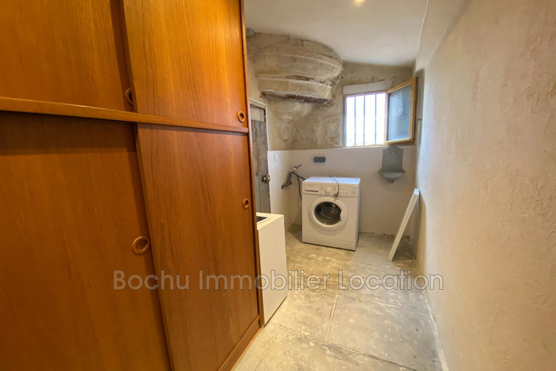 Quiet and bright, the apartment includes an entrance with storage, a bedroom with built-in closets overlooking the courtyard, a living room, a separate fully equipped kitchen (hob, dishwasher, oven, refrigerator), a bathroom with a walk-in shower, and two outbuildings upstairs: a 12 m² office in an old tower with independent access, and an 8 m² laundry room fitted with a washing machine and a large closet.
