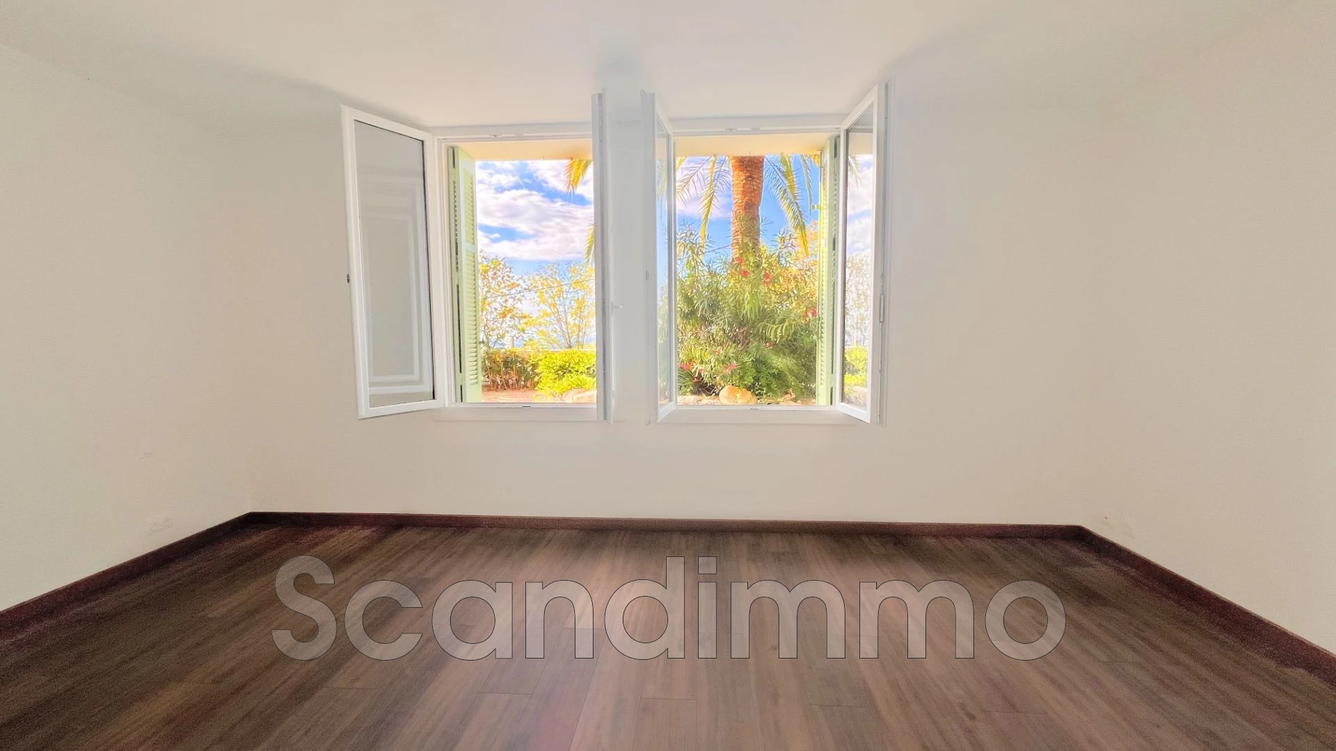 The large living area with an open-plan kitchen leading to the dining room naturally extends onto a 26 m² terrace, which opens onto a private 447 m² garden — a true green haven enhanced by palm trees, perfect for entertaining, relaxing, or enjoying the Mediterranean climate in complete privacy.