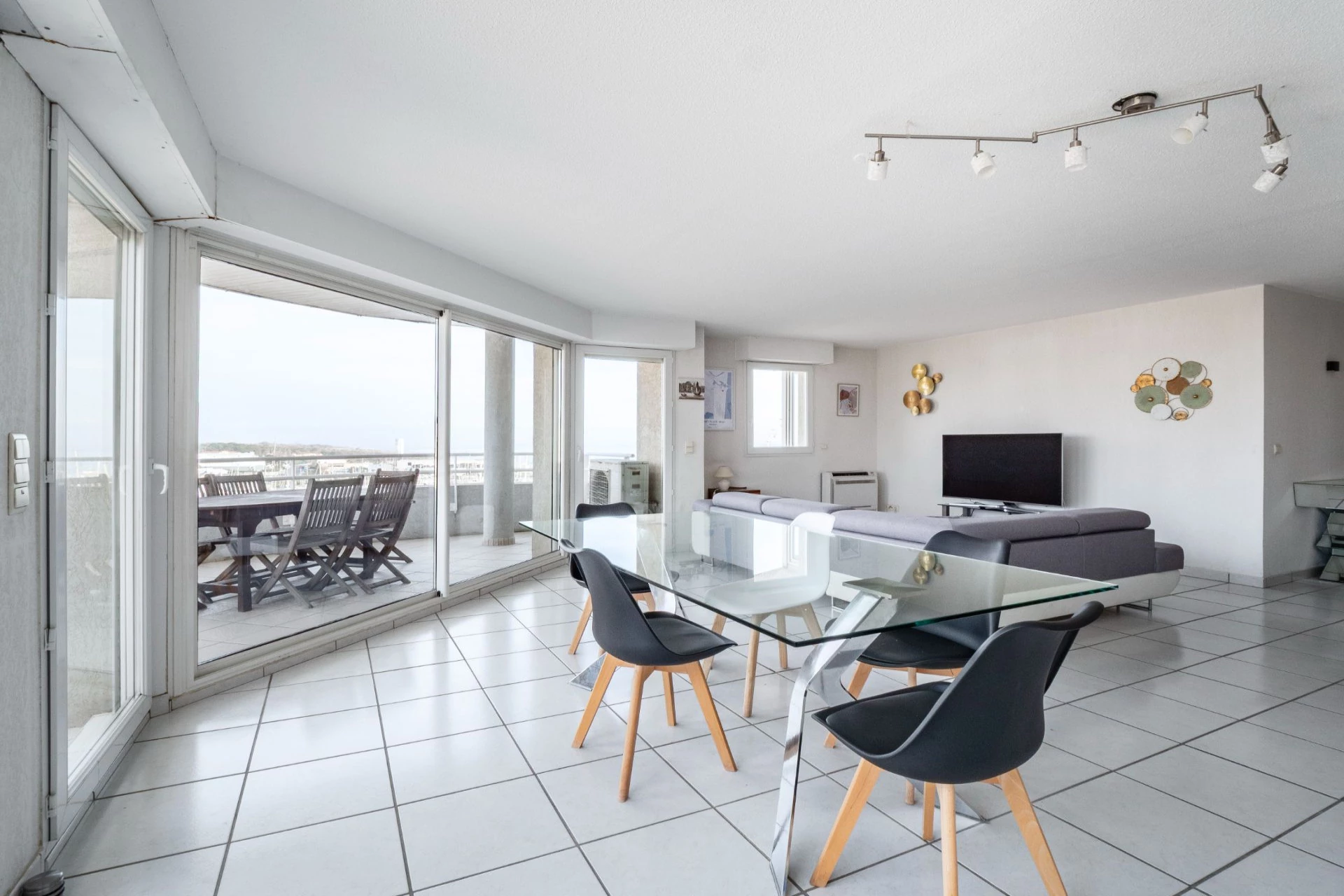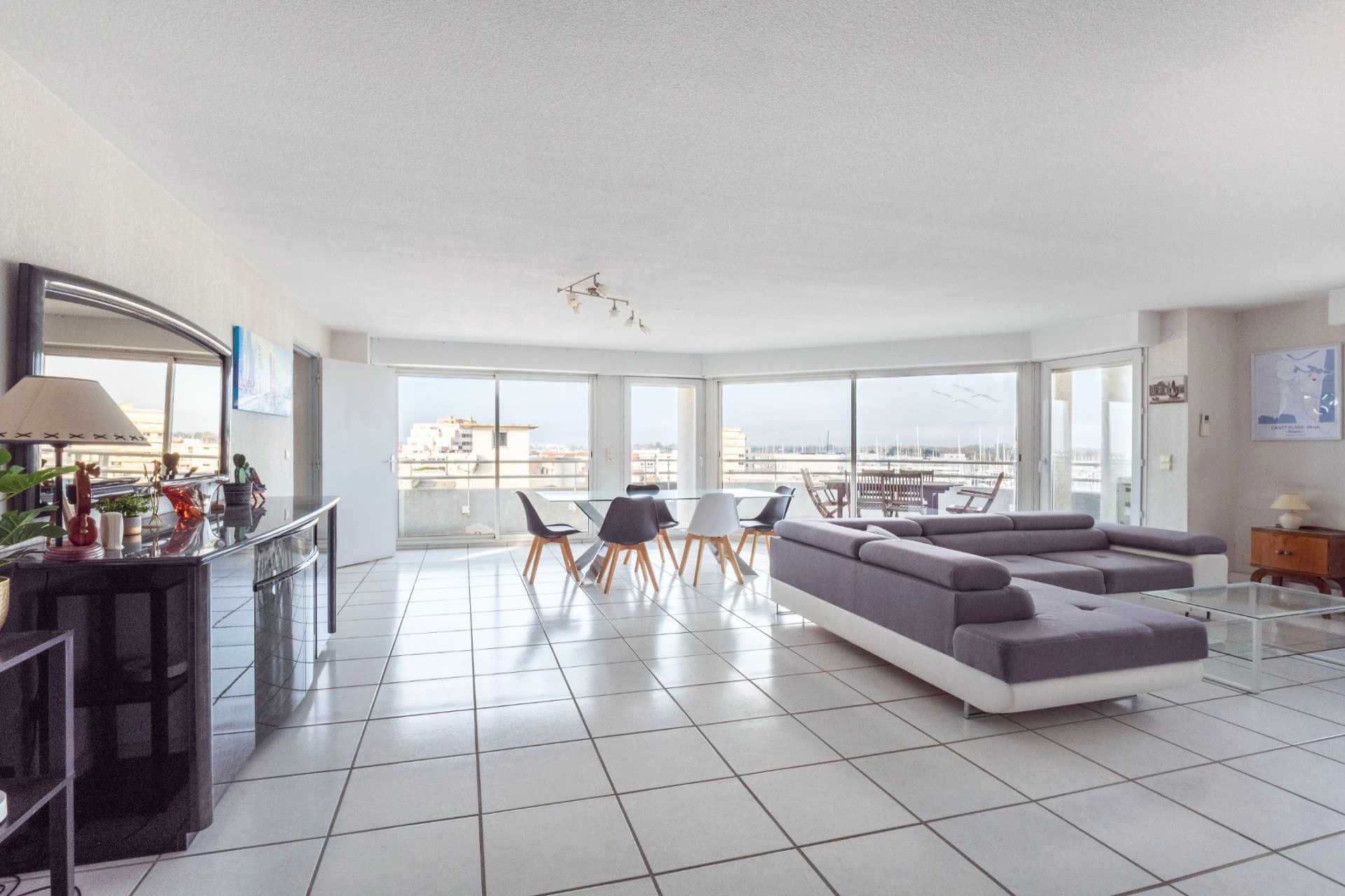 Its spacious 56 m² living room, bright and stylish, offers an exceptional panoramic view of the sea, the Canigou, and the marina.