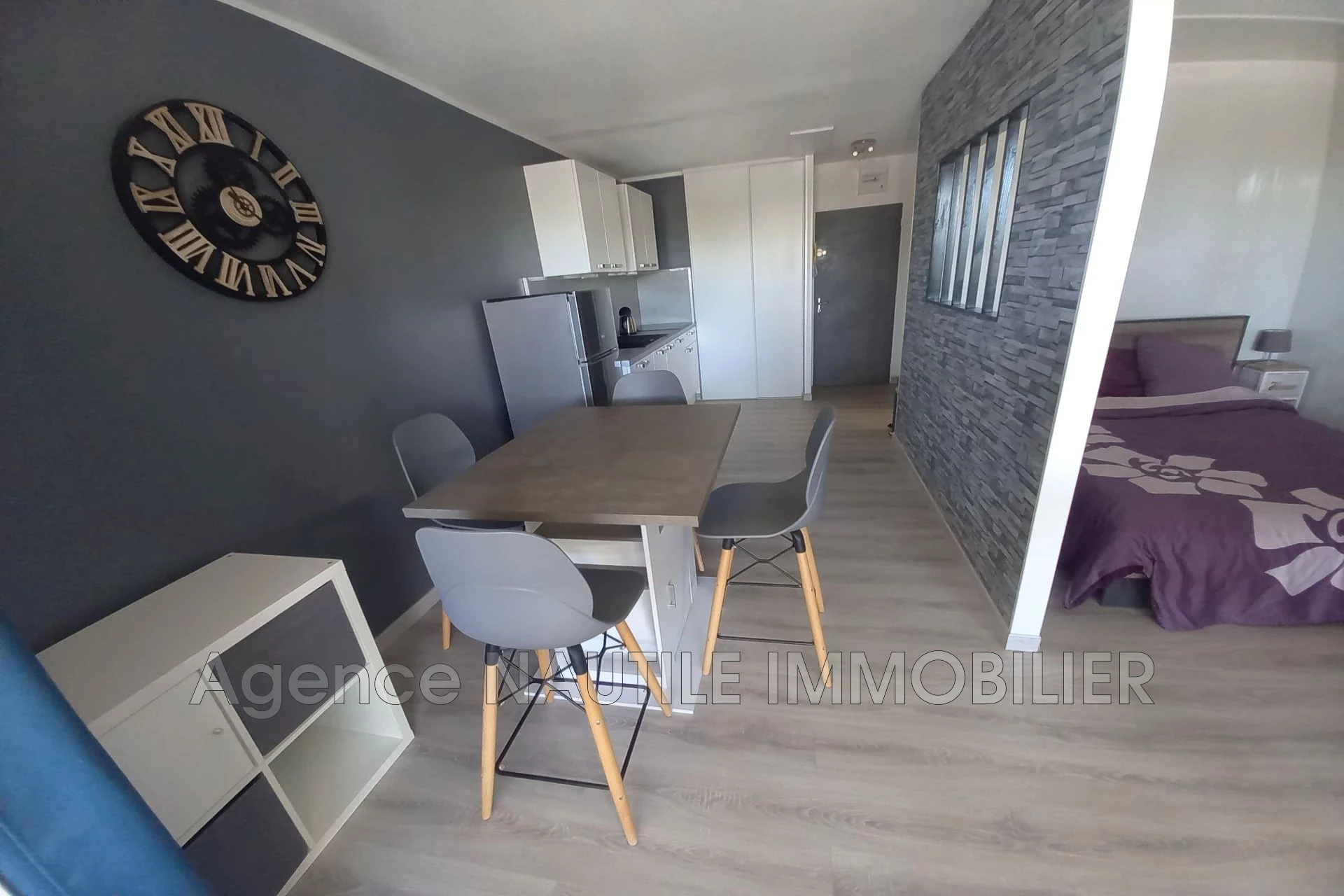 In the heart of La Grande Motte town center, in a well-maintained small building with an elevator, a large studio with a sleeping area, renovated and in excellent overall condition, offering a comfortable space of 36m² (27m² + 9m² glazed loggia), dining area with a beautiful open kitchen, sleeping corner, bathroom with toilet, glazed loggia, low fees, large cellar in the basement.