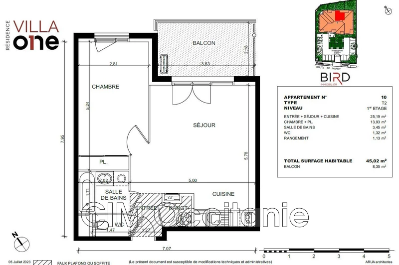 For rent: a T2 apartment of 45.02 m² on the 1st floor of a new building, located in the town of Eaunes on Route de Muret.