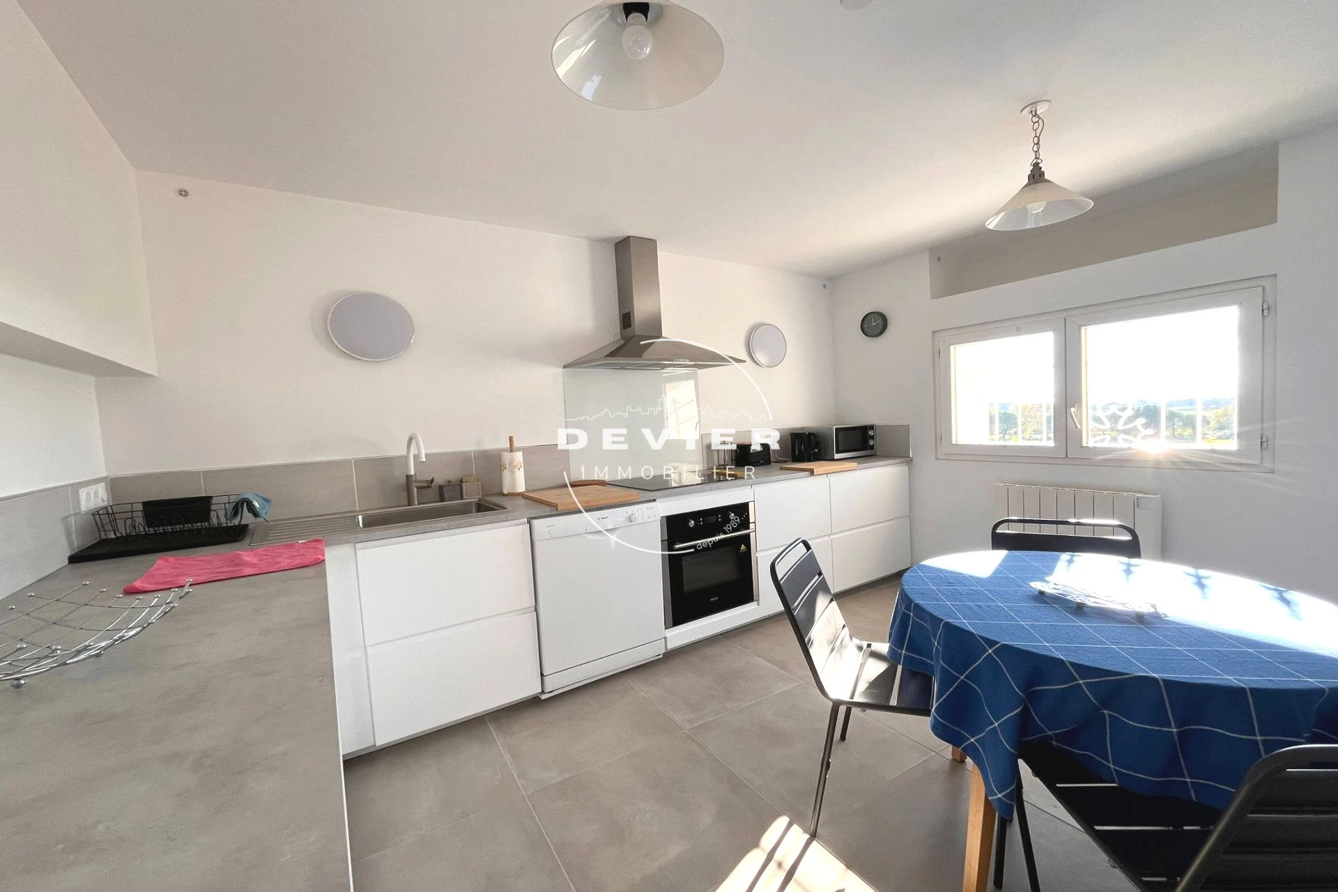 A spacious and bright living room with an exceptional open view, decorated with a large closet. A recent independent kitchen, fully equipped (cupboards, sink, induction hob, extractor hood, oven, dishwasher, refrigerator). A shower room with WC. A huge tiled garage of 42 m², offering many possibilities (storage, workshop, parking), with direct access to a private courtyard of 24 m².