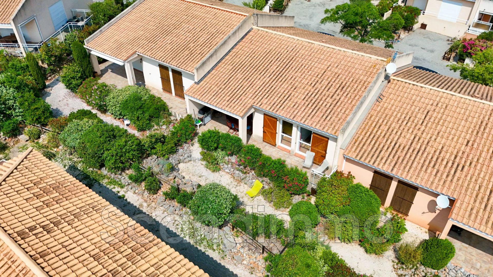 Charming single-story house with terrace, flower garden, sea view and pool access – in private estate in Fitou In the popular Capitelles area, above Fitou, this single-story semi-detached house will charm you with its comfort and its surroundings. Upon entering, a lovely hall with a closet and a shower room with a guest toilet set the tone: here, everything has been designed to combine well-being and practical solutions.