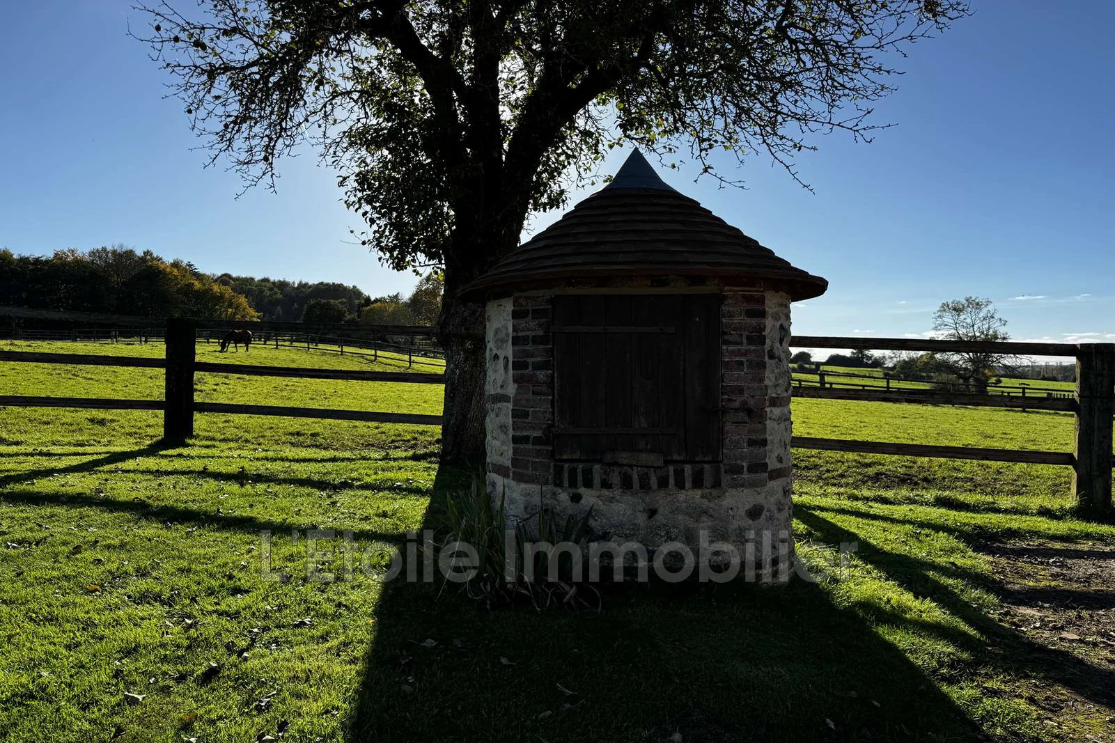 it consists of 13 fenced paddocks with 8 shelters and automatic waterers, 2 barns (for stabling and fodder), 6 stalls, and a comfortable house thanks to its flat tile roof, insulation, boiler, and new windows.