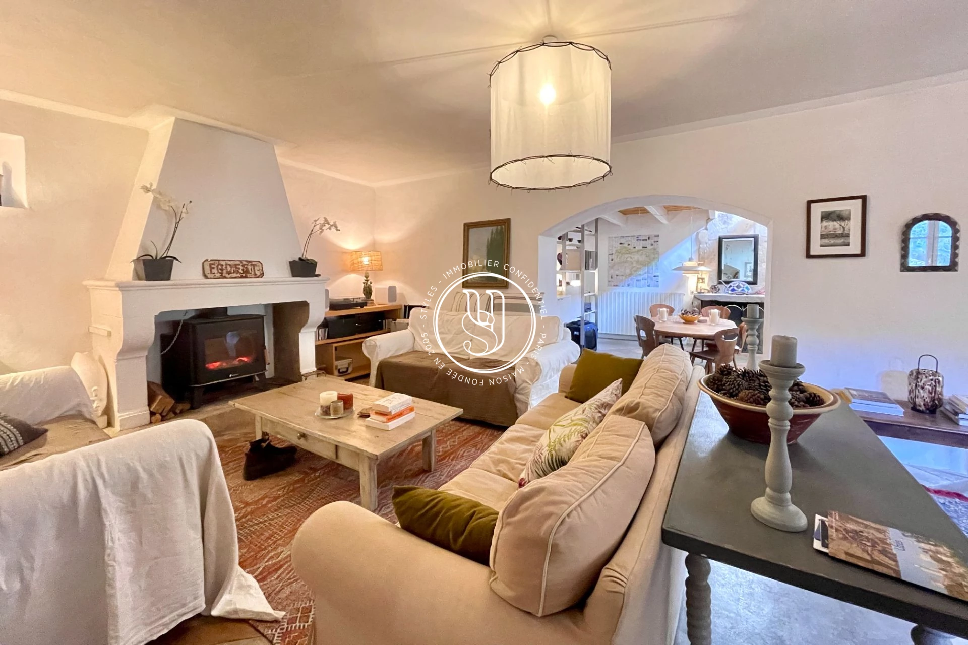 Entering from the street, stairs lead to a spacious double-height kitchen/dining room. Both the kitchen and living room have access to a pleasant, sunny covered terrace; a door leads directly from the kitchen to a covered terrace, ideal for al fresco dining and aperitifs. Adjacent to the dining room is a spacious living room with a beautiful fireplace and wood-burning stove. The floors on this level feature a unique pattern of polished concrete, wood, and terracotta. On this same level, there is a large, air-conditioned bedroom overlooking the garden and a bathroom.
