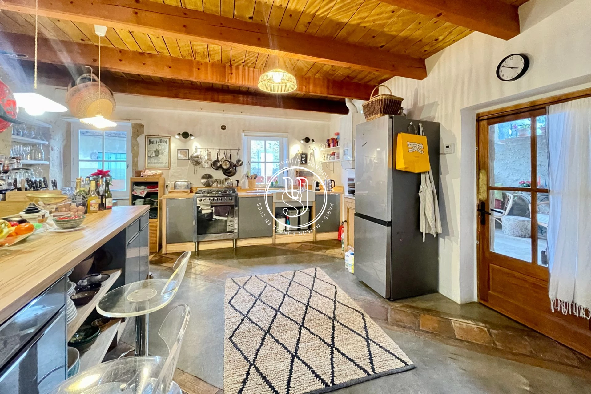 On the ground floor, the charming 50m² enclosed garden (with the possibility of a pond, already granted by the Town Hall) is backed by an outdoor dining room under a vaulted ceiling. Also on the ground floor of the building are a games room, a workshop and a garage.