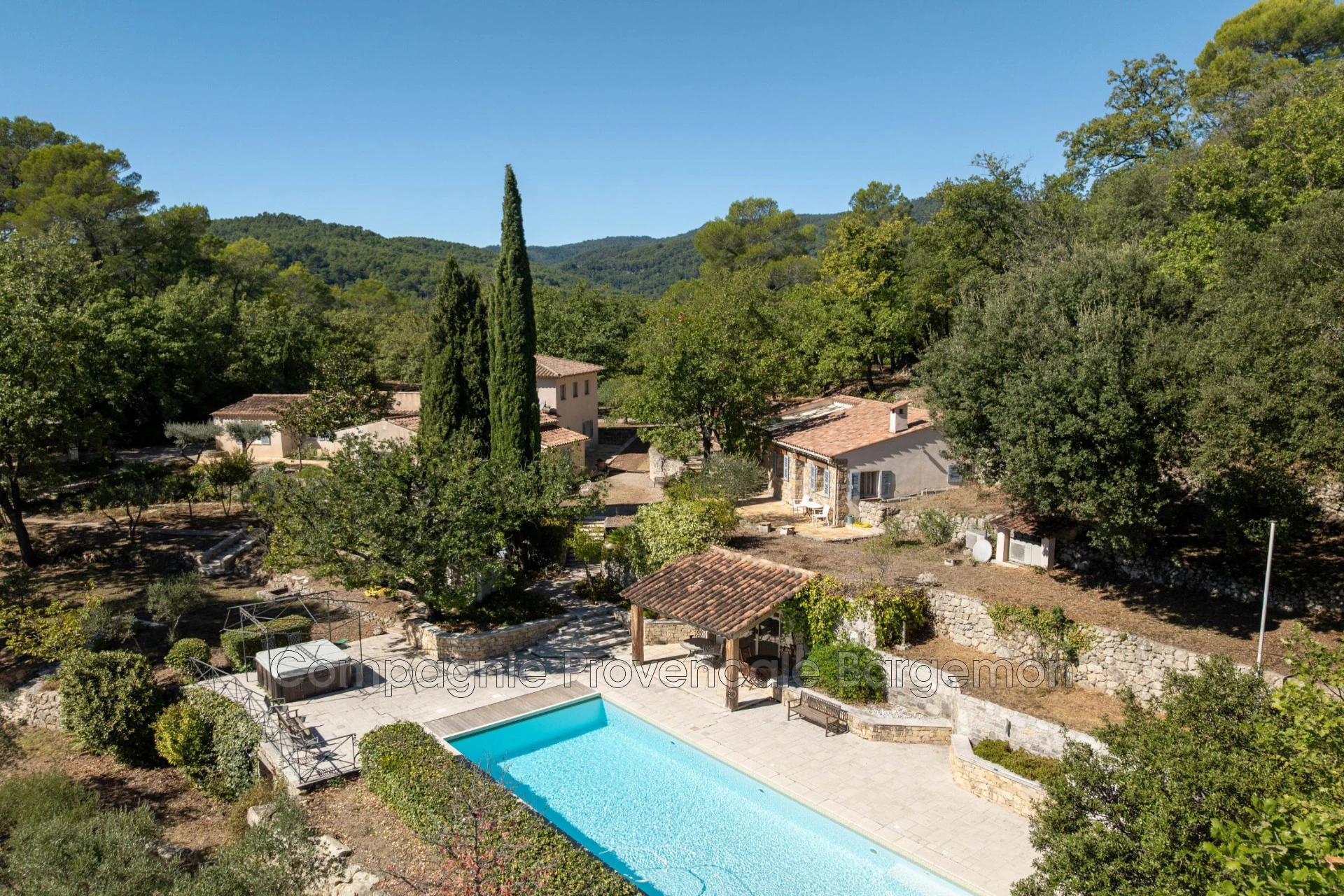 Set on a 27,000 m² land with olive trees, this beautiful estate includes a villa of approx. 205 m², a stone Mazet of 55 m², a 25 m² chalet, a 15 m² stone shed, and a stunning pool with a 33 m² pool house.