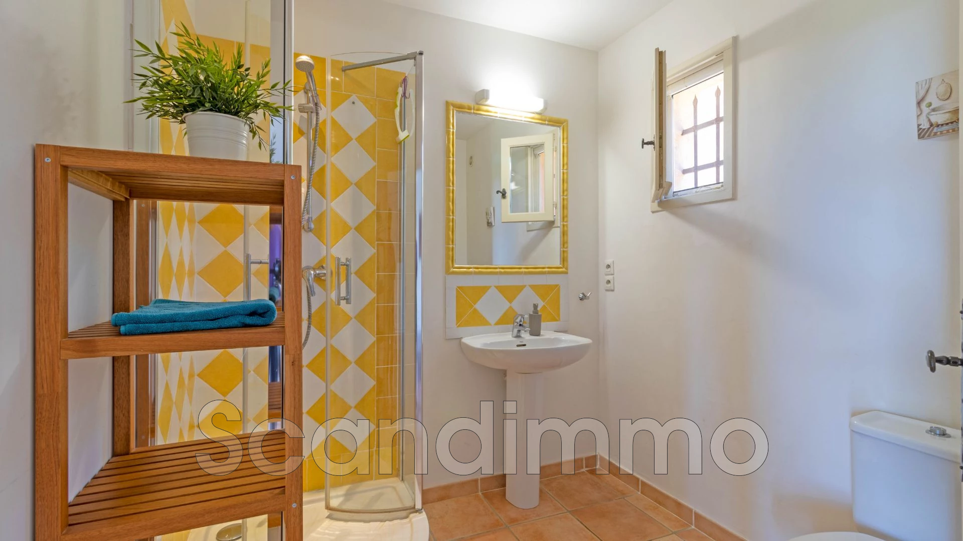 Upstairs, two more air-conditioned bedrooms, each with a shower room and WC, plus exclusive use of a terrace with superb views over the countryside and Grimaud Castle.