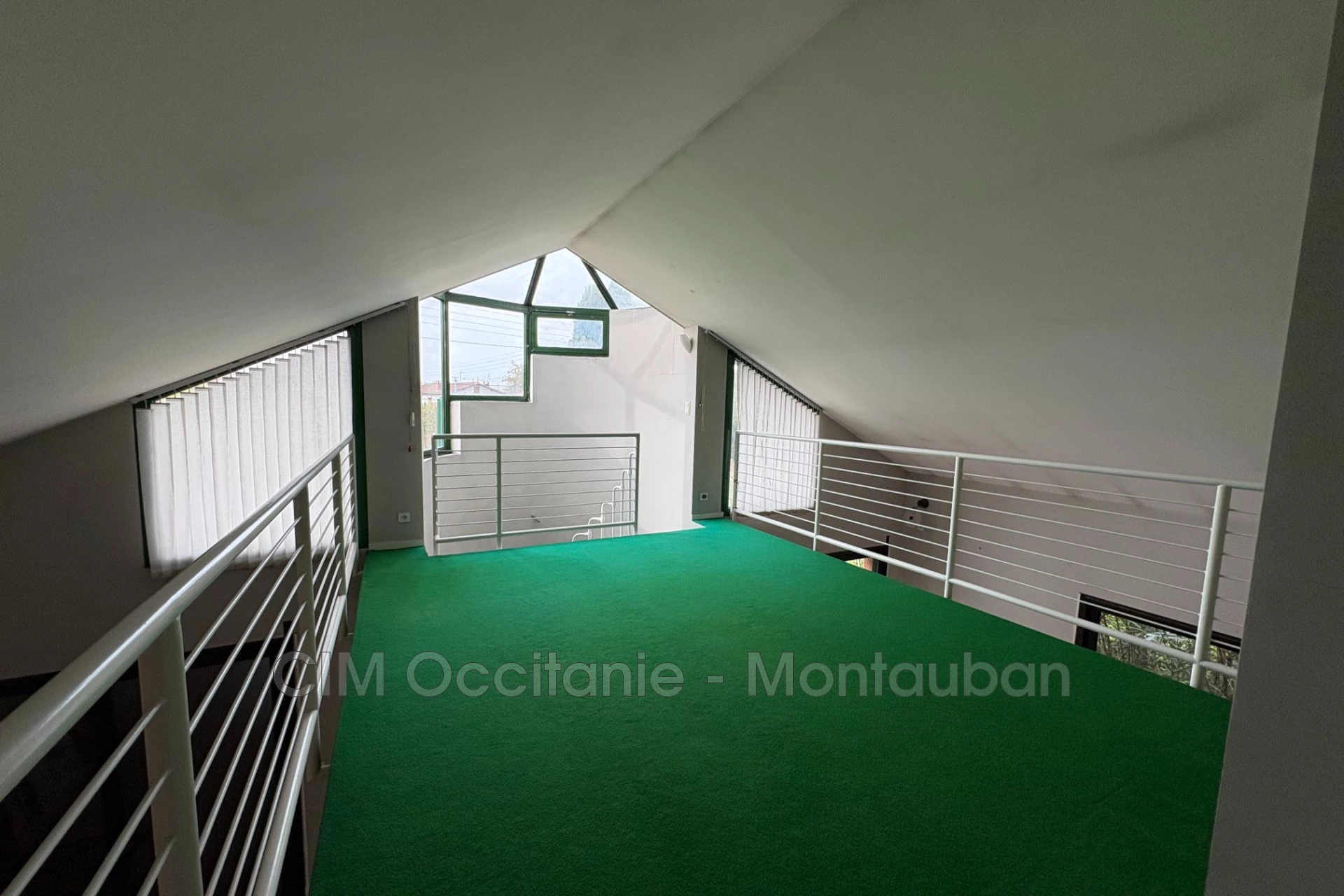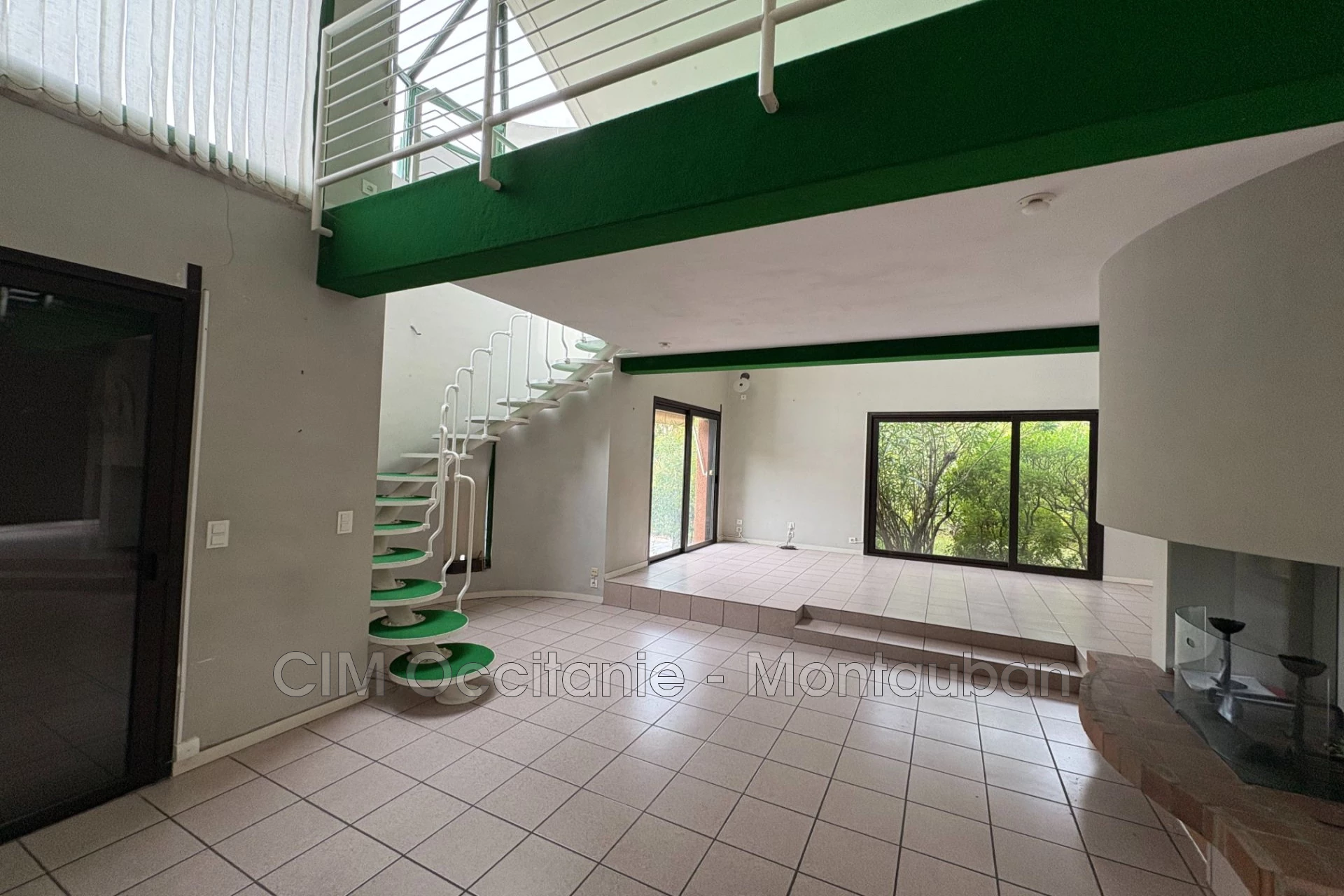 It features a large entrance leading to a bright and spacious 62 m² living room with high ceilings, two large glass doors opening to the outside, and a fireplace. The living room includes a mezzanine perfect for setting up an office, a playroom, or a fitness area.