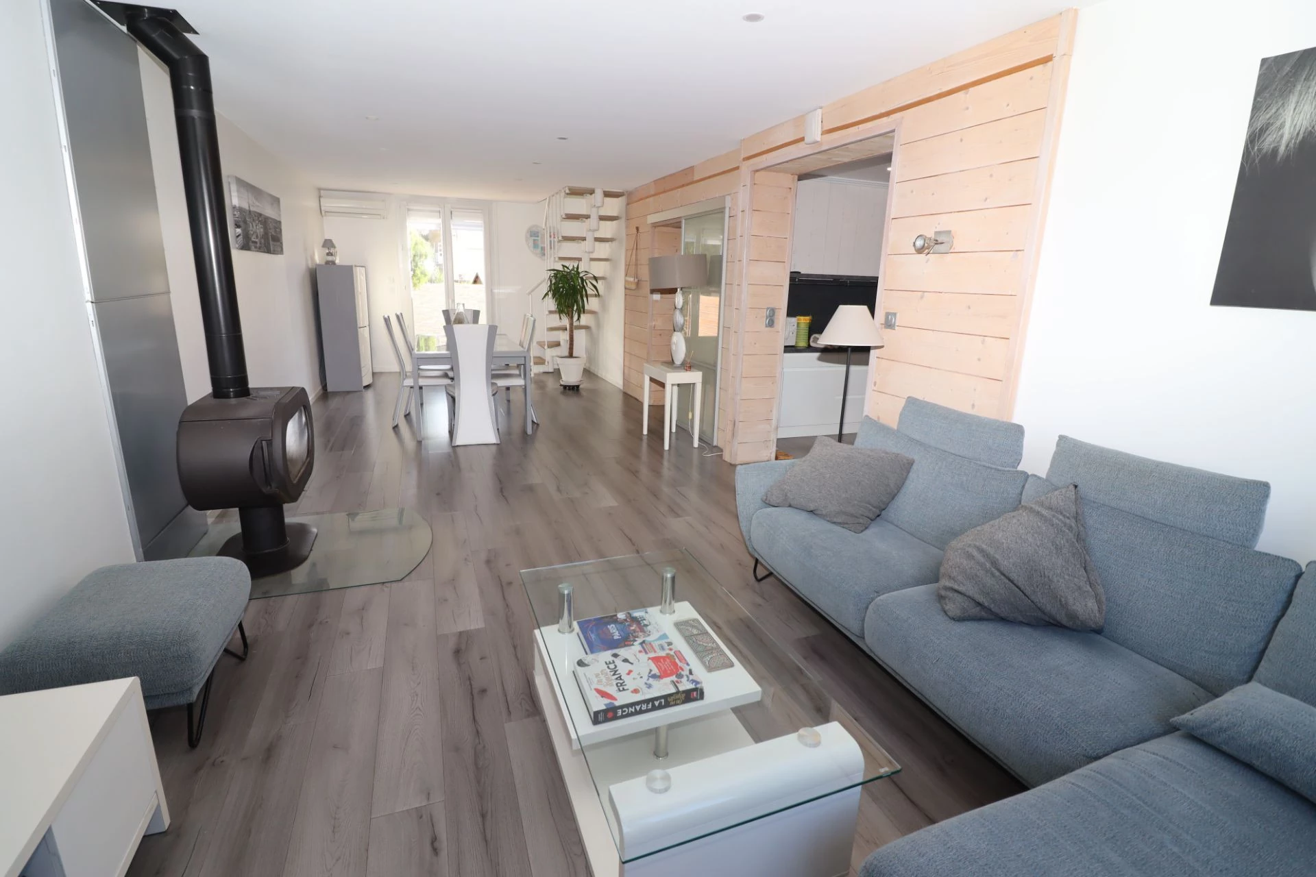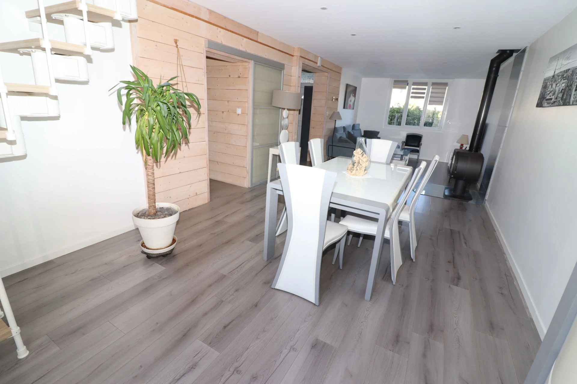 In a residential neighborhood, this charming four-sided house offers 170m² of living space, featuring a bright living room with a wood-burning stove, a large equipped kitchen, 3 lovely bedrooms, and a bathroom with a window. Upstairs, there are 3 spacious bedrooms, a bathroom, and a shared lounge/relaxation area. The garden includes a swimming pool with wooden decking and terraces.