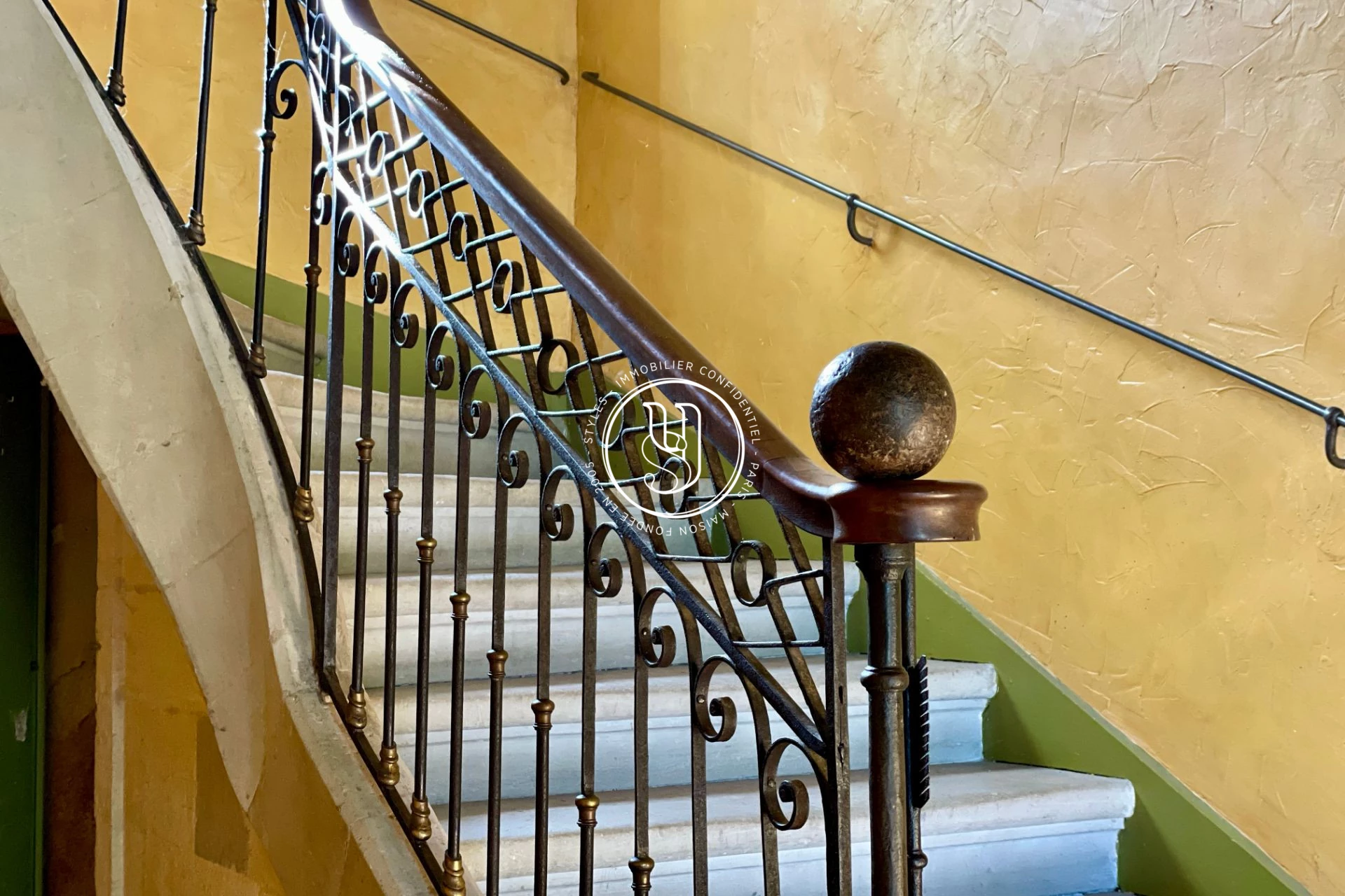 Behind its authentic façade, the ground floor reveals generous spaces: a living room with classic French ceilings, a cozy dining room featuring a period fireplace, and a kitchen with direct access to the south-facing terrace... A beautiful and spacious bedroom plus a bathroom complete the ground floor.