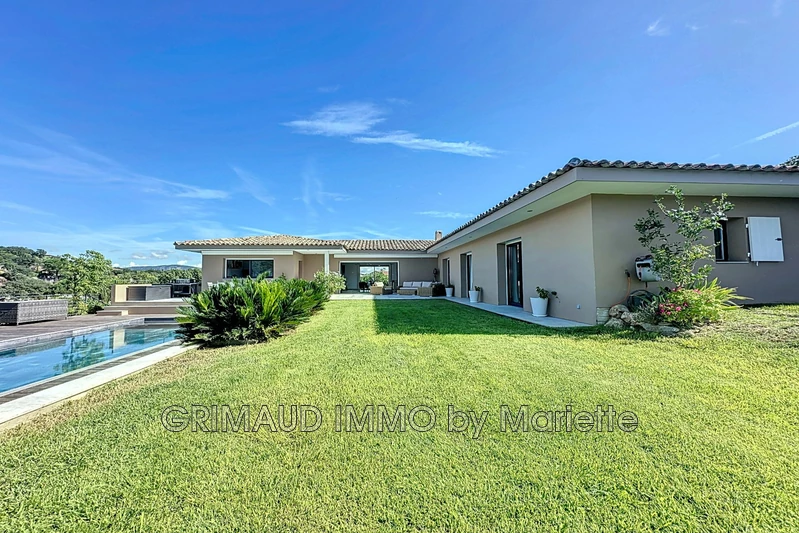 Beautiful view of the countryside, hills and vineyards for this contemporary property, located in a quiet area in a secure domain on 1600m² of enclosed land with large garage and plenty of storage, heated salt pool with roller shutters comprising: entrance, guest toilet, large living/dining room, an open fitted...