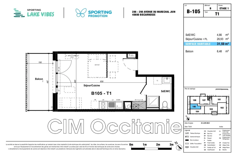 BISCARROSSE - Dans une résidence neuve livrée en Septembre 2025, et situé au 1er étage, appartement de type 1 de 31.59m² comprenant une entrée sur séjour avec une cuisine ouverte aménagée et équipée avec un placard, une terrasse carrelée, un WC...