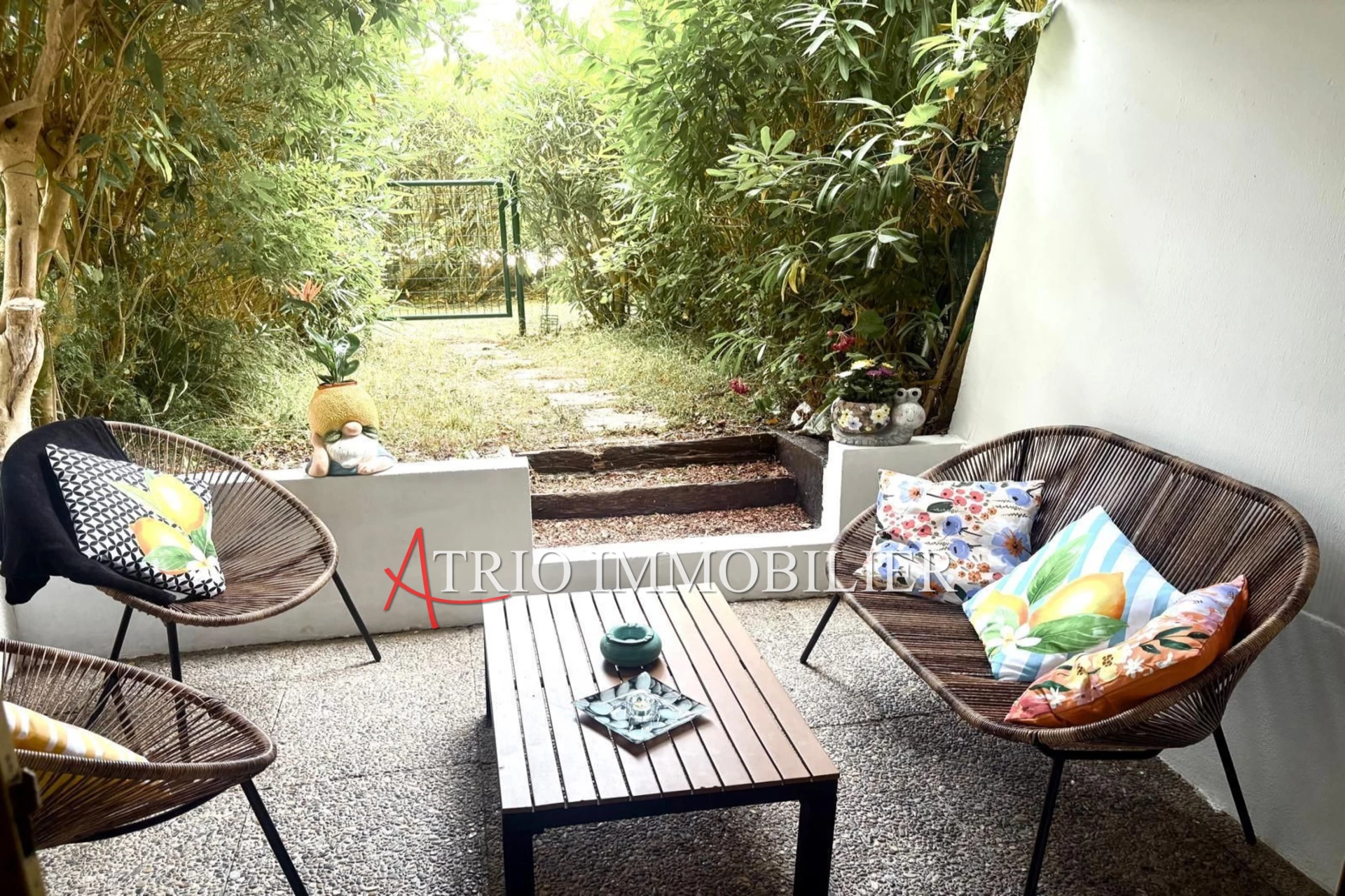 L'appartement se compose d'une entrée cabine avec lit, d'une salle d'eau avec WC, d'un coin rangement pratique et d'un séjour/cuisine offrant un accès direct à une belle terrasse/jardin.