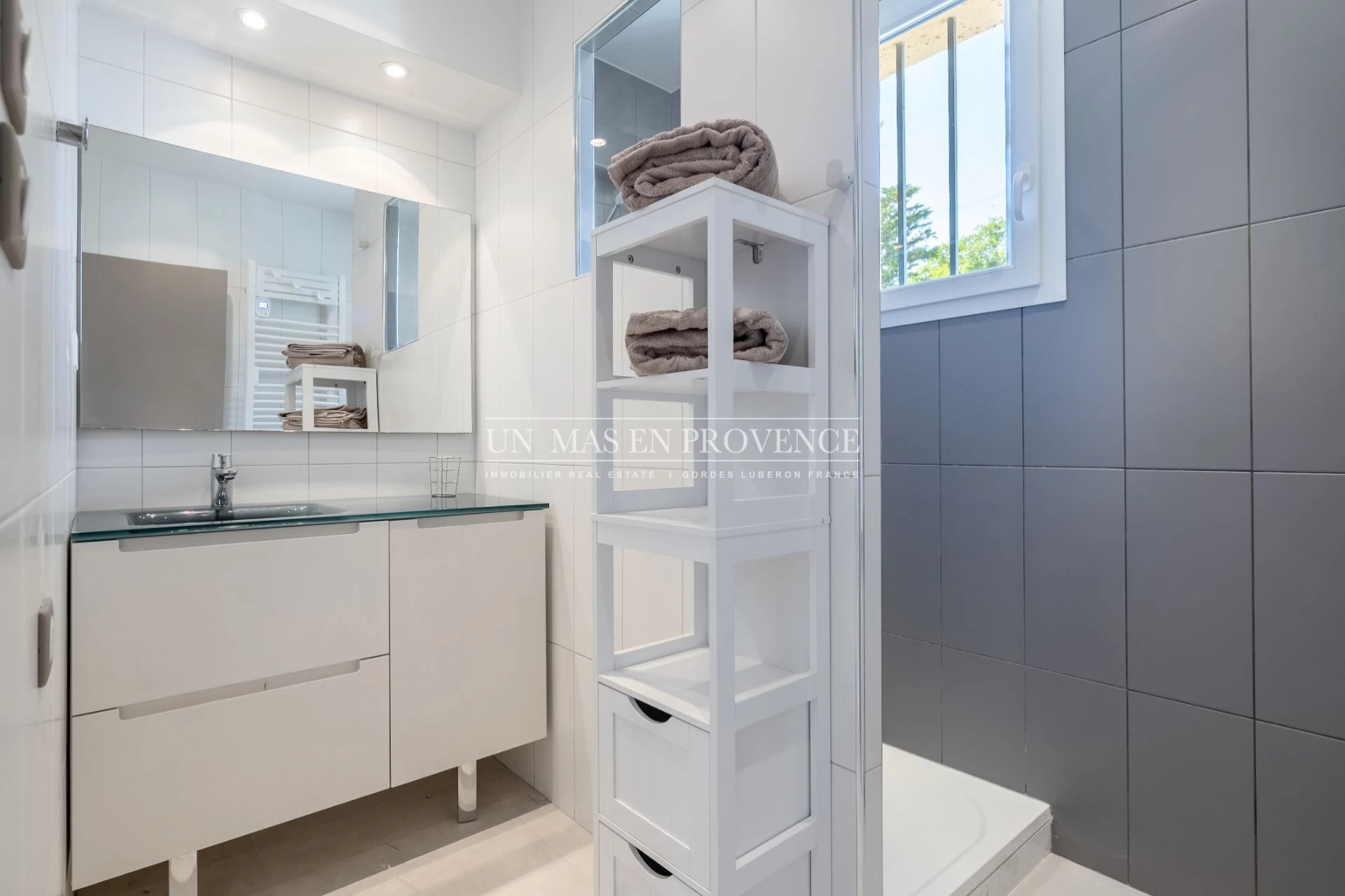 Salle d'eau avec douche, vasque et sèche-serviettes