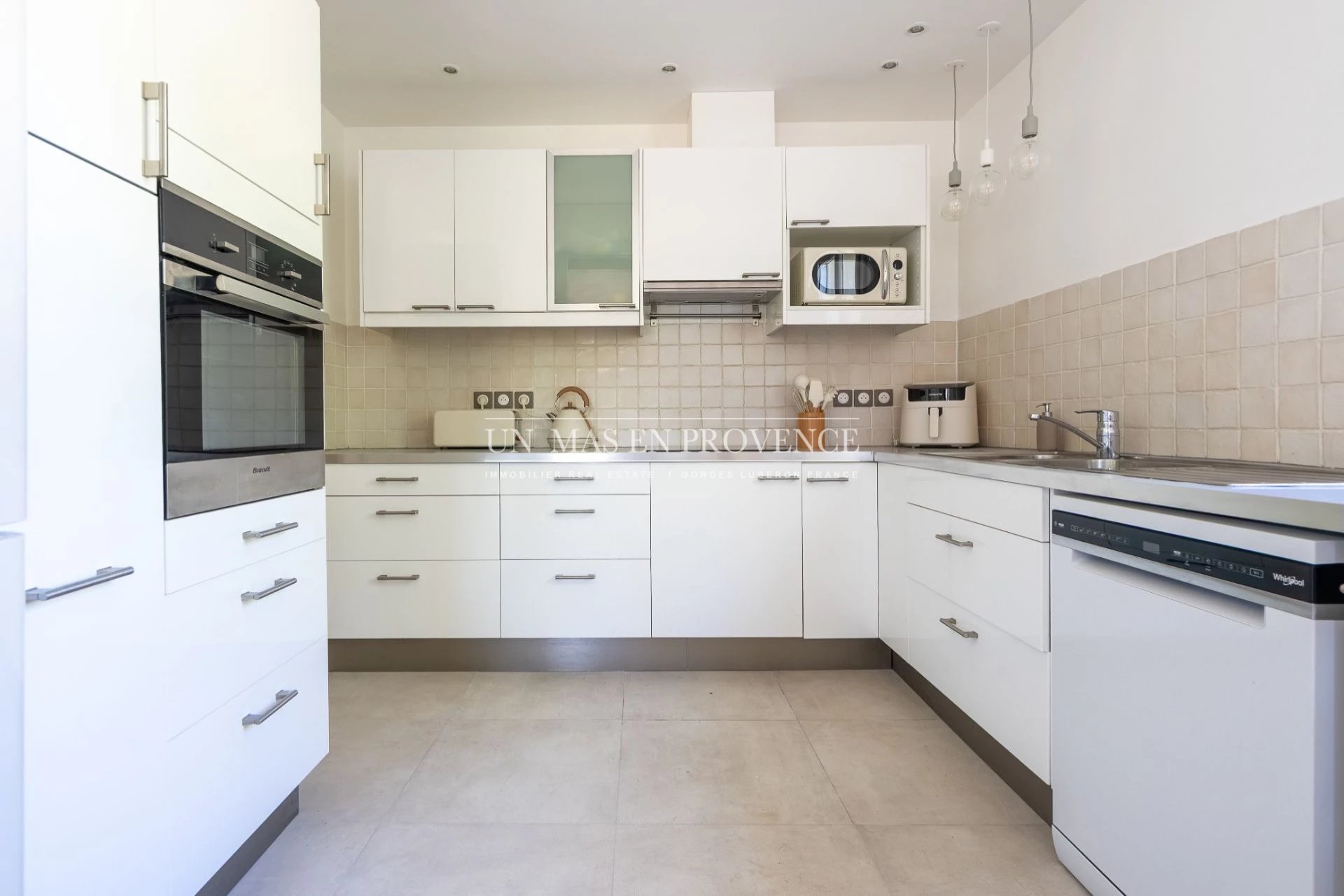 réfrigérateur-congélateur (type américain), lave-vaisselle, four, micro-ondes, plaque à induction, airfryer, cafetière Nespresso, cafetière filtre, bouilloire, grille-pain, vaisselle et ustensiles complets
