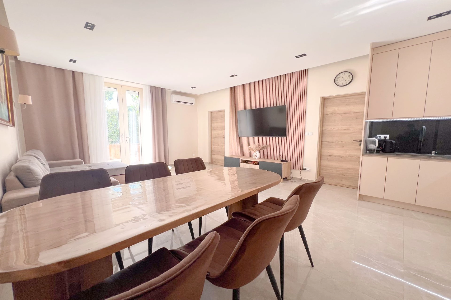 Une vaste pièce de vie regroupant séjour, salle à manger et cuisine américaine, entièrement équipée, avec de nombreux rangements sur mesure, deux grandes chambres, un grand bureau (ou 3ème chambre), une salle de bain, un WC invité.