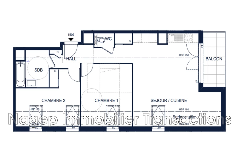 En dernier étage avec accès privatif par ascenseur, spacieux appartement comprenant hall d'entrée, belle salle de séjour de 33 m², cuisine indépendante, chambre principale avec placards, 2ème chambre ou bureau, salle d'eau avec douche/ w-c et w-c indépendant.