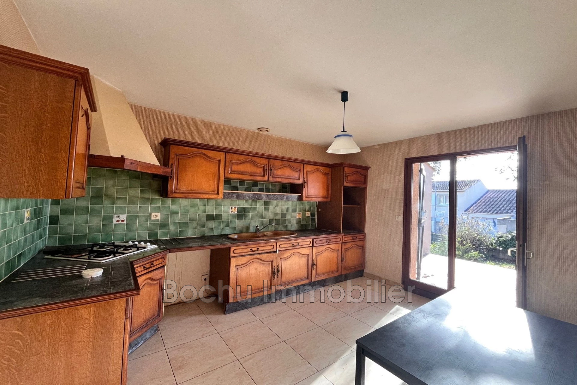 Séjour avec cheminée (insert), terrasse de 27 m2, cuisine indépendante,