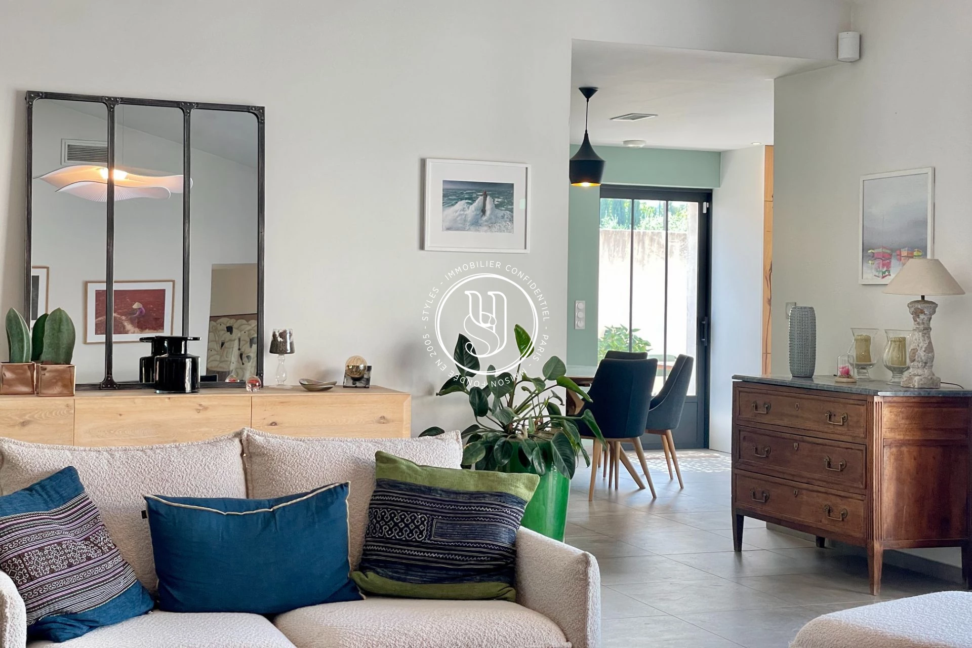 À l'extérieur, un jardin clos et paysagé de près de 900 m², magnifiquement exposé, accueille plusieurs espaces détente, une piscine au sel 6x6 aux abords soignés, ainsi qu'un éclairage intégré pour en profiter à toute heure.