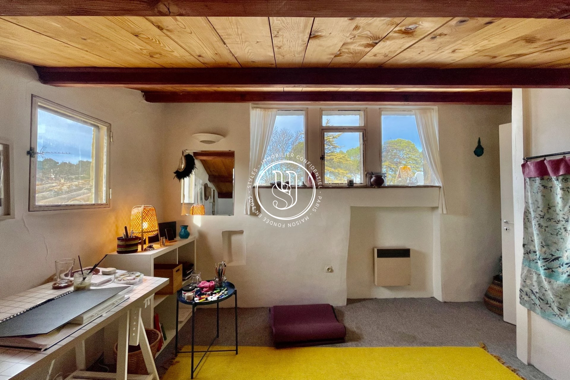 En entrant par la rue, des escaliers mènent à une vaste pièce cuisine / salle à manger à la double hauteur. La cuisine et le salon ont accès à une agréable terrasse couverte ensoleillée, une porte mène directement de la cuisine à une terrasse couverte, idéale pour les repas en plein air et les apéritifs. A côté de la salle à manger, un salon spacieux avec une belle cheminée et son poêle à bois. Les sols de ce niveau sont composés d'un motif unique de béton ciré, de bois et de terre cuite. Sur ce même niveau, une grande chambre climatisée donnant sur le jardin et une salle de bains.