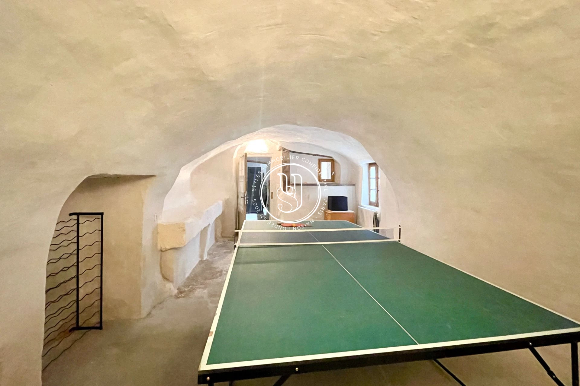 Au rez-de-chaussée, le charmant jardin clos de 50m2 (possibilité de bassin, déjà accordé par la Mairie) est adossé à une salle à manger d'extérieur sous voûte. Au rez-de-chaussée de la bâtisse se trouvent également, une salle de jeux, un atelier et un garage.