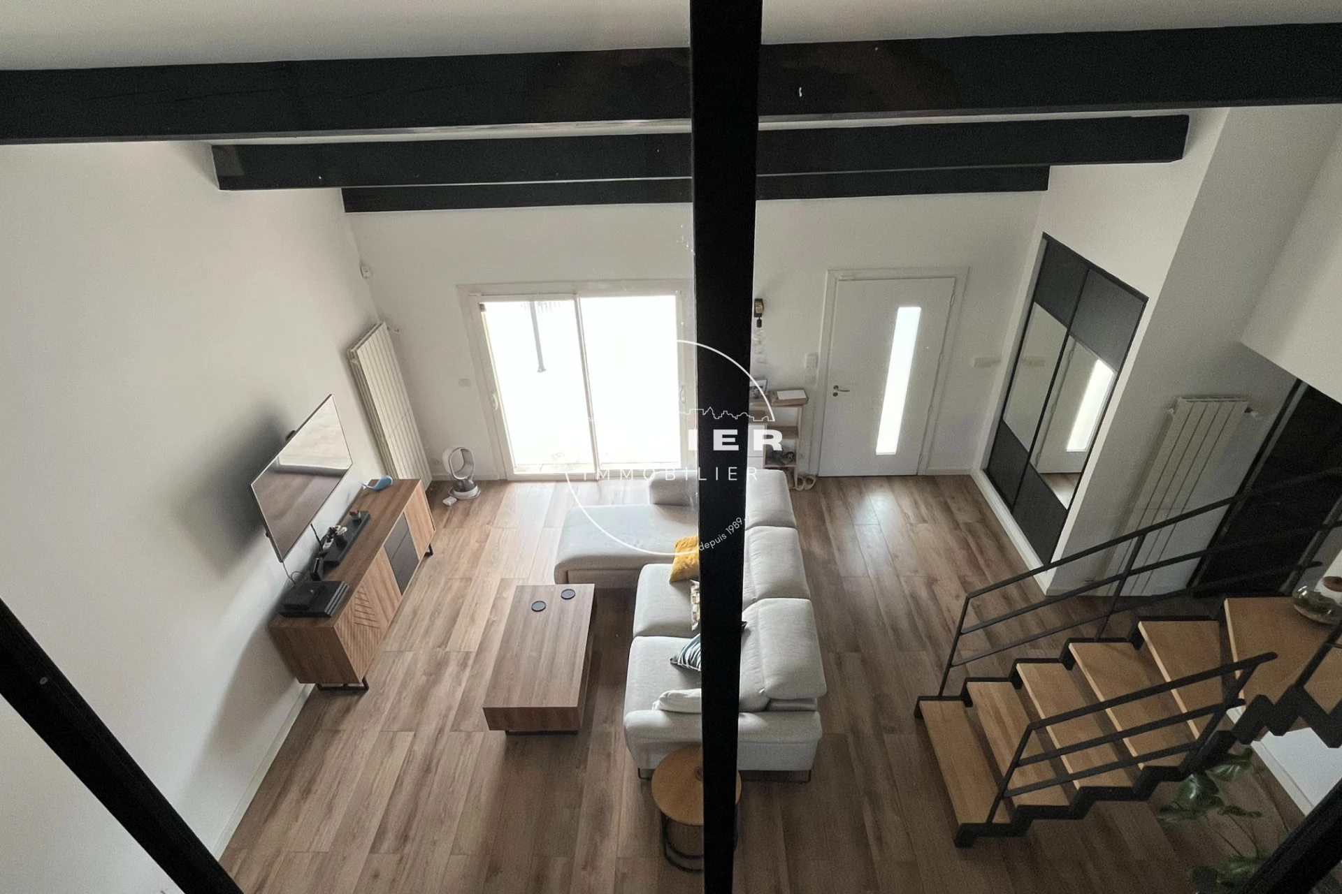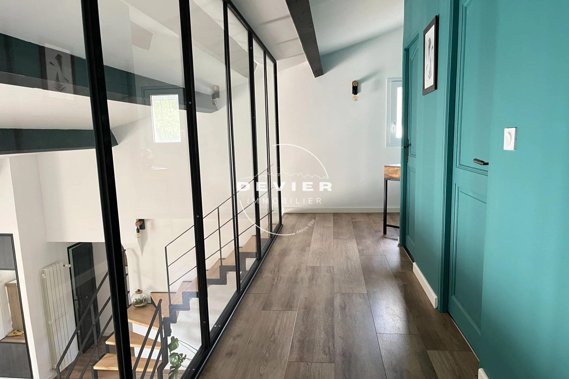 - à l'étage : coursive avec verrière esprit atelier surplombant la pièce de vie, 2 chambres avec placards, un grand dressing, une jolie salle d'eau et un WC séparé