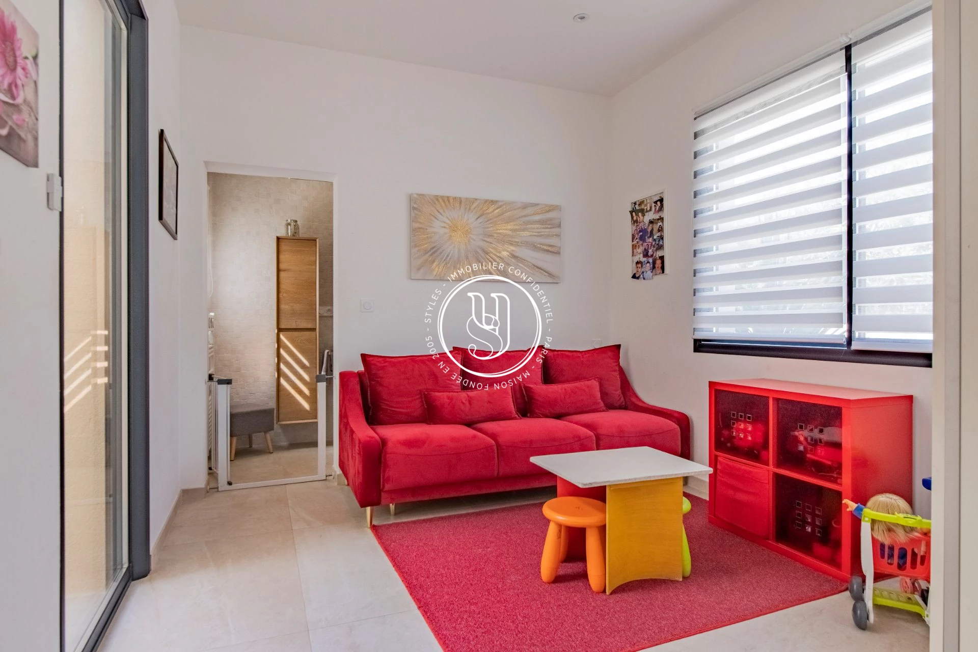En rez-de-chaussée : Très grande pièce de vie baignée de lumière en accès direct sur la piscine et la terrasse.