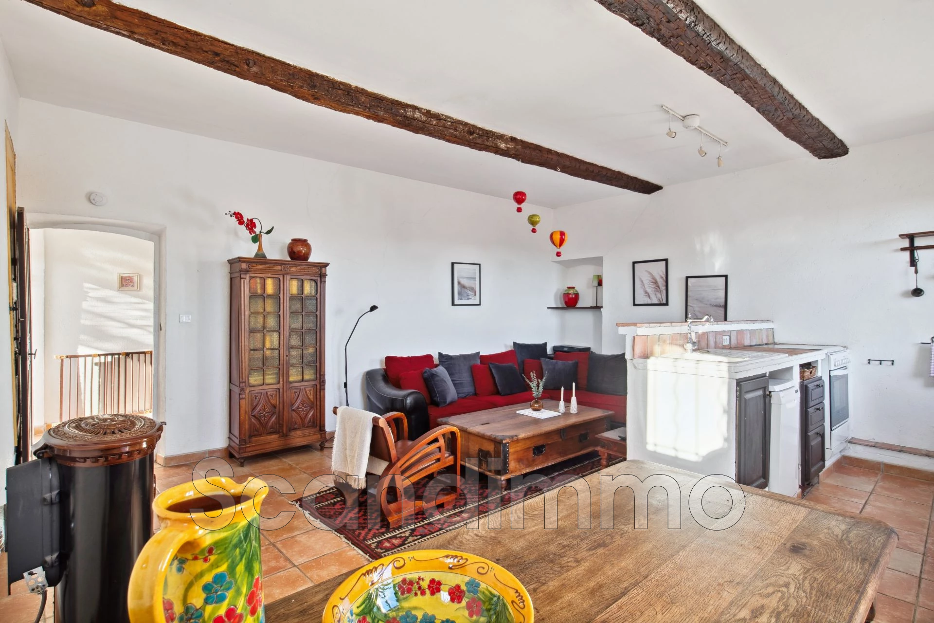 Enfin en haut de l'escalier au 2ème étage se trouve sur la gauche la pièce de vie de bonne dimension, très lumineuse, proposant une superbe vue dégagée sur les toits et les collines au loin. La cuisine toute équipée se trouve dans cette pièce, ainsi que la partie salle à manger et un petit salon canapé / TV.
