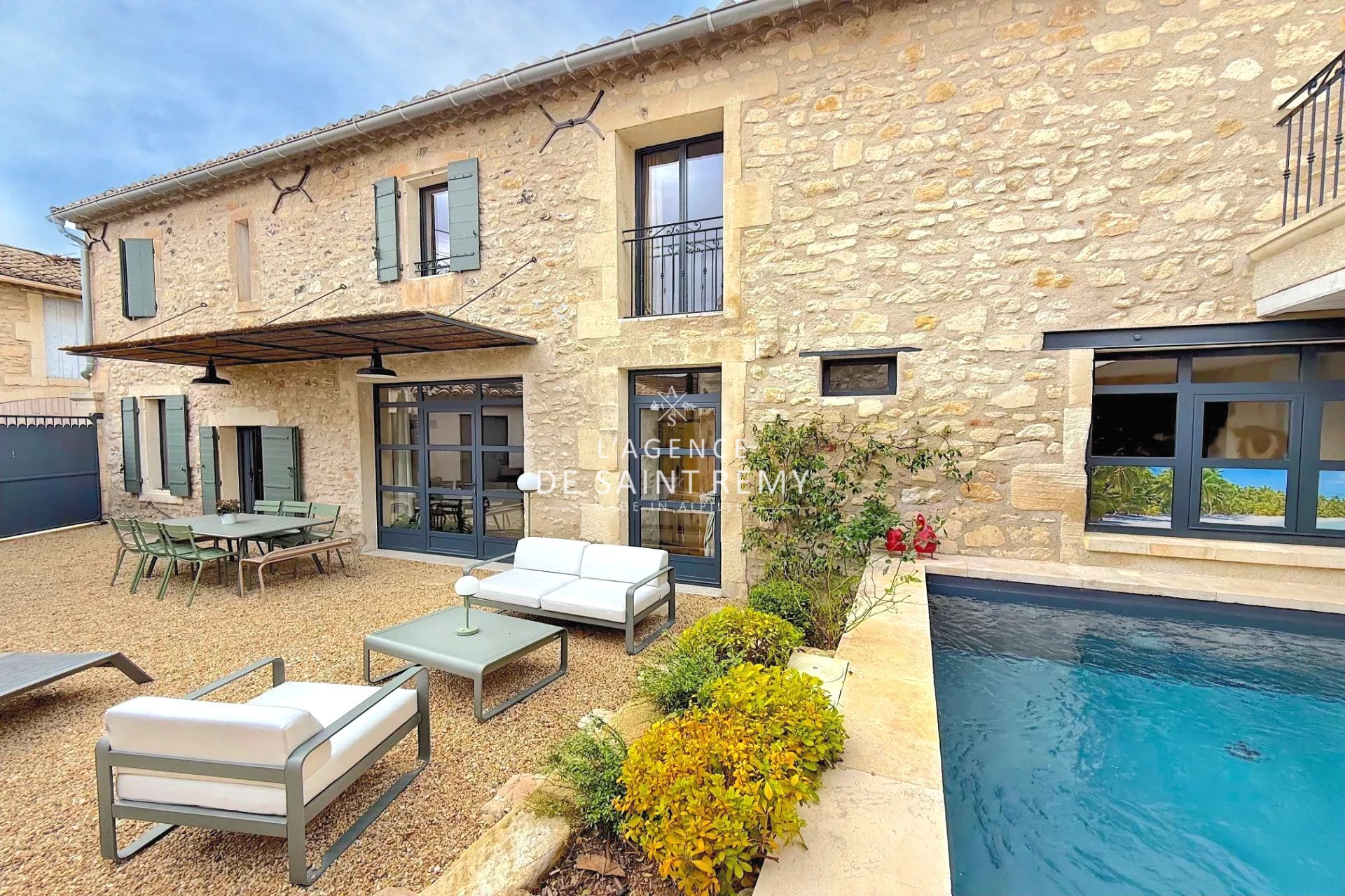 Ce Mas de ville s'aborde par une cour intérieure d'où l'on profite de la magnifique façade en pierres apparentes, d'une treille pour ombrager la terrasse extérieure et d'un bassin tout cela complété de bordures en pierres, fontaine, végétaux & éclairage extérieur …