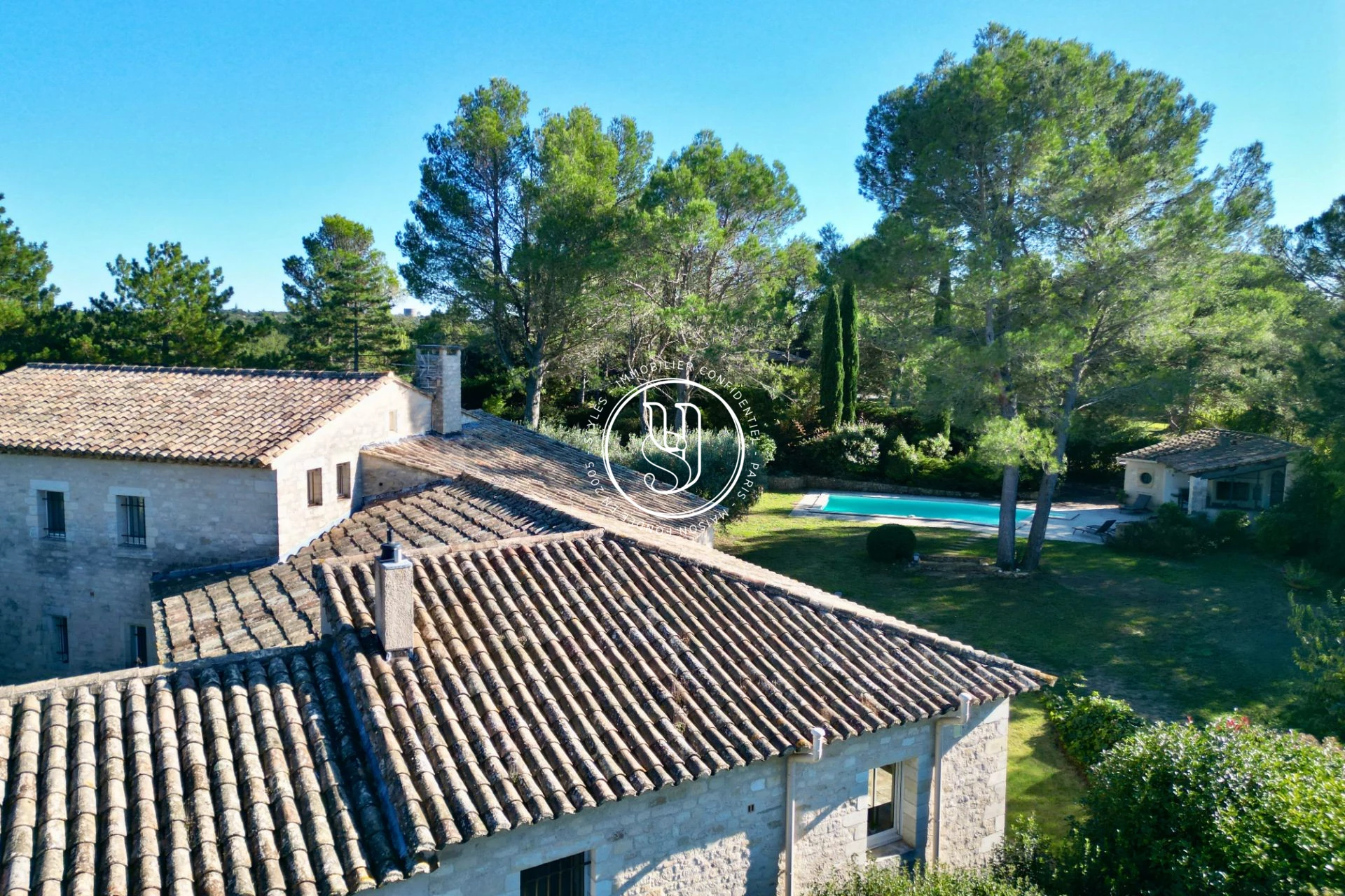 L'extérieur est composé de divers espaces : parkings, restanques, vaste piscine avec sa cuisine d'été et son local technique, un bel écrin et sa double haie mettant en valeur la bâtisse située en son milieu, protégée par les pins.