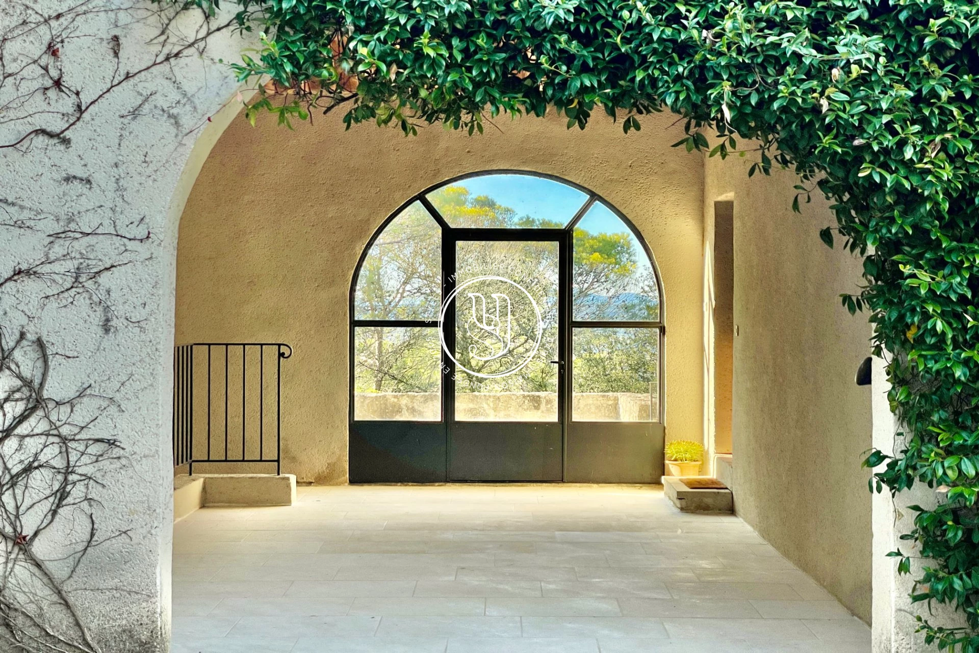 La distribution des lieux est idéale : un vaste salon (et sa belle cheminée) s'ouvrent par de larges ouvertures sur le jardin et ses essences méditerranéennes, puis une salle à manger ouvrant directement sur une terrasse couverte et la cuisine équipée avec son cellier/buanderie se succèdent sans couper les volumes.