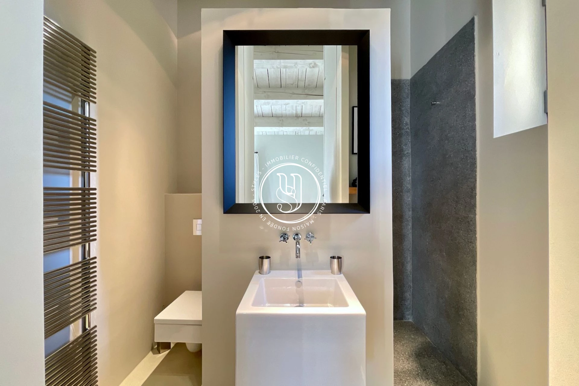 Les pièces de vie, baignées de lumière grâce à de grandes ouvertures cintrées, s'articulent autour d'un salon convivial, d'une vaste salle à manger avec sa cheminée en pierre et d'une cuisine élégante et parfaitement équipée, complétée par une arrière-cuisine.
