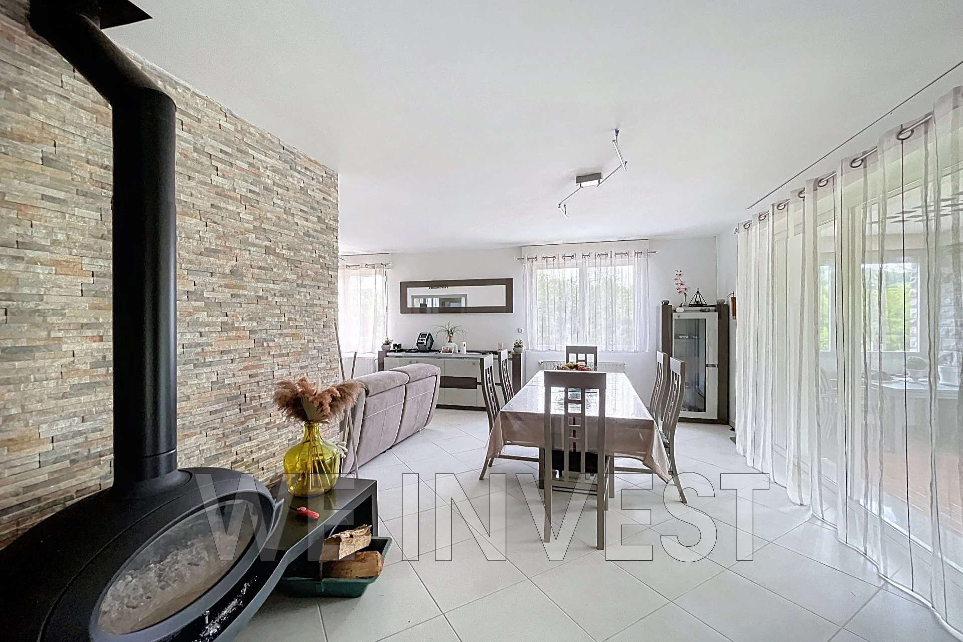 Le séjour, d'une superficie de 31 m², est le cœur battant de cette demeure. Imaginez-vous y accueillir vos proches, partager des moments inoubliables autour d'un bon repas avec sa cuisine de 10 m² semi-ouverte ou simplement vous détendre après une longue journée à côté du poêle à bois design. Les fenêtres à double vitrage garantissent une bonne isolation de cette maison. Une véranda accessible par la pièce à vivre permet de profiter de l'extérieur.