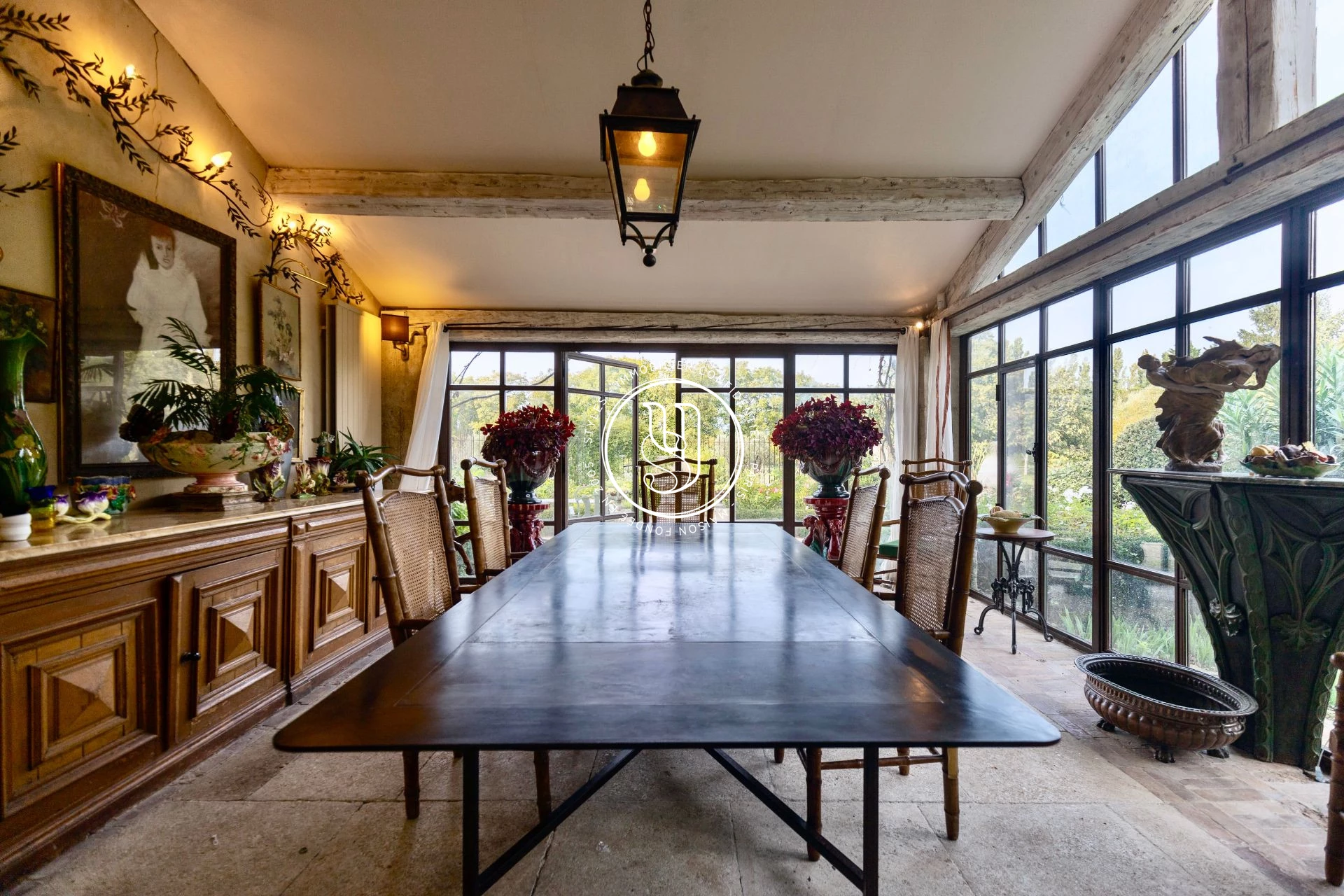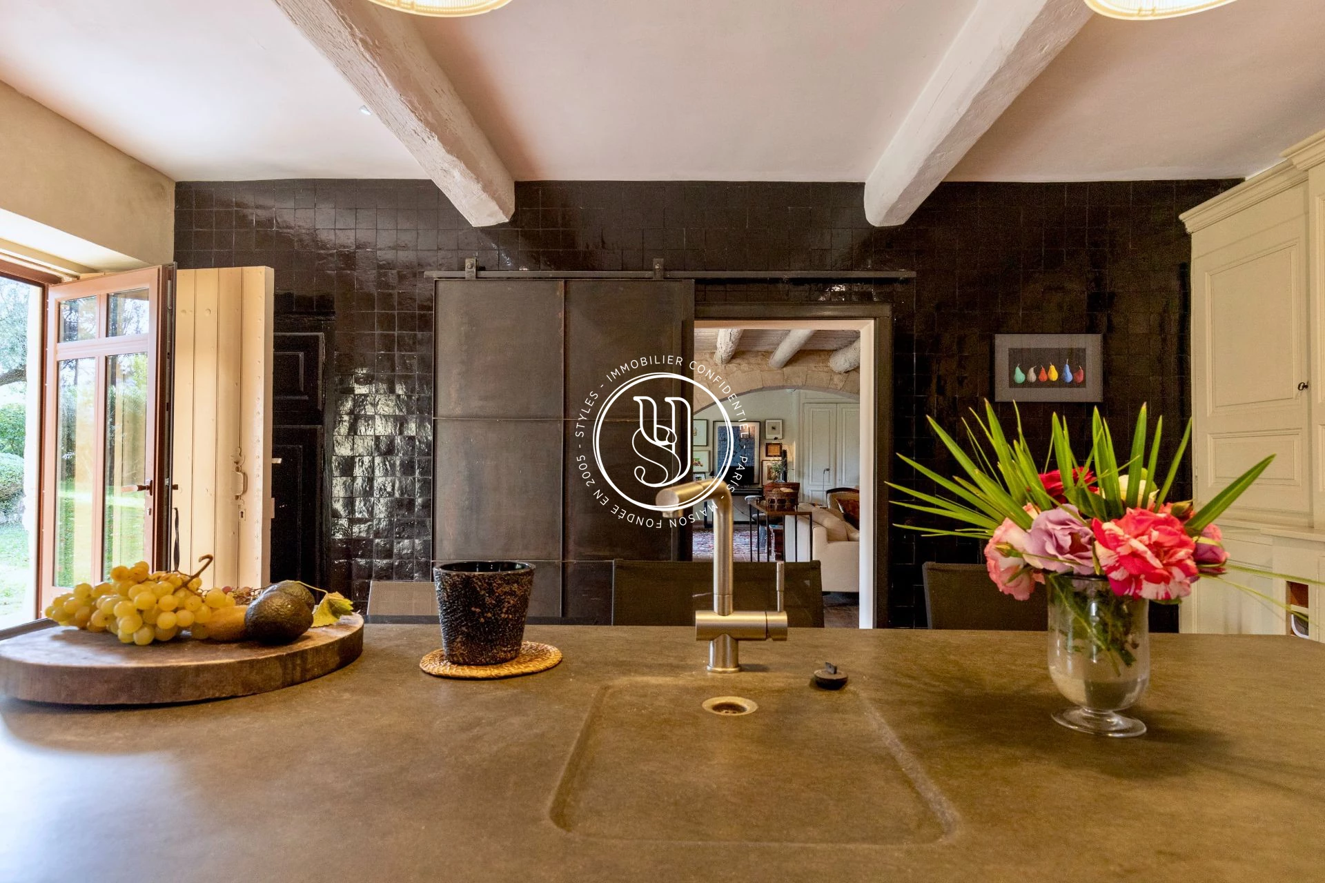 Située à Eygalières, superbe propriété du XVIII° siècle de plus de 450m², située au sein d'un beau terrain paysagé de 2,5 hectares. Cet ensemble se compose d'un mas de caractère, avec ses beaux volumes et restauré avec goût. Il se caractérise par son calme, ses vues, son ambiance apaisante sous ses arbres séculaires et plus généralement par la végétation enveloppante. Ces extérieurs se composent en effet d'un parc, d'espace potager, de paddocks et d'un espace piscine( 7 par 14) végétalisé, avec son kiosque aménagé. Il se complète par une maison de gardien attenante et par de vastes annexes : atelier, studio d'enregistrement, boxes pour chevaux et sellerie.