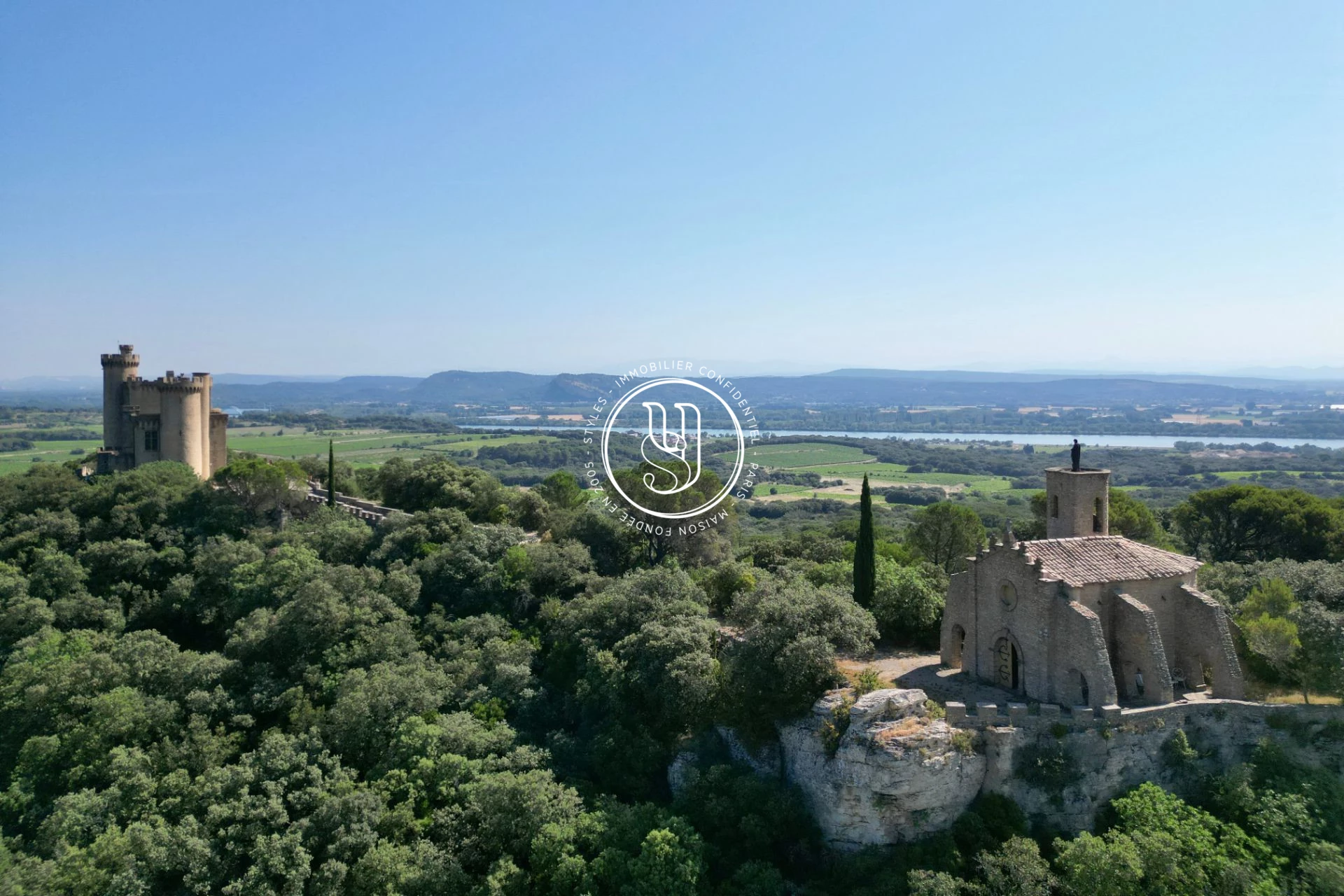 Dominant la vallée du Rhône depuis son promontoire rocheux, ce château néo-médiéval construit autour de 1900 déploie ses pierres blondes face à un panorama spectaculaire allant du mont Ventoux jusqu'au Luberon. Située à seulement 50 kilomètres d'Avignon et d'Uzès, cette propriété conjugue la sérénité d'un domaine préservé à la proximité des hauts lieux culturels et historiques de Provence.